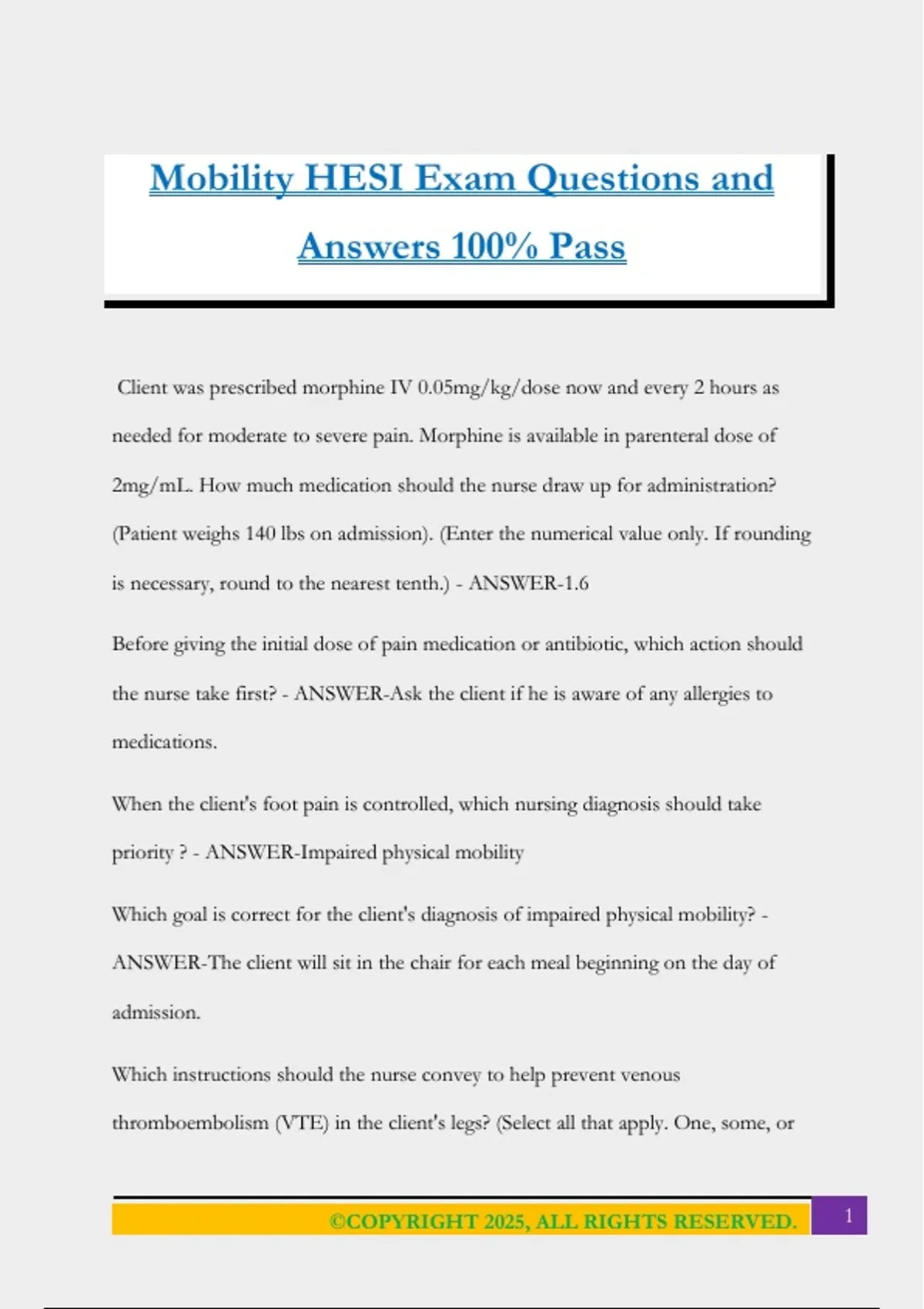 Mobility HESI Exam Questions and Answers 100% Pass