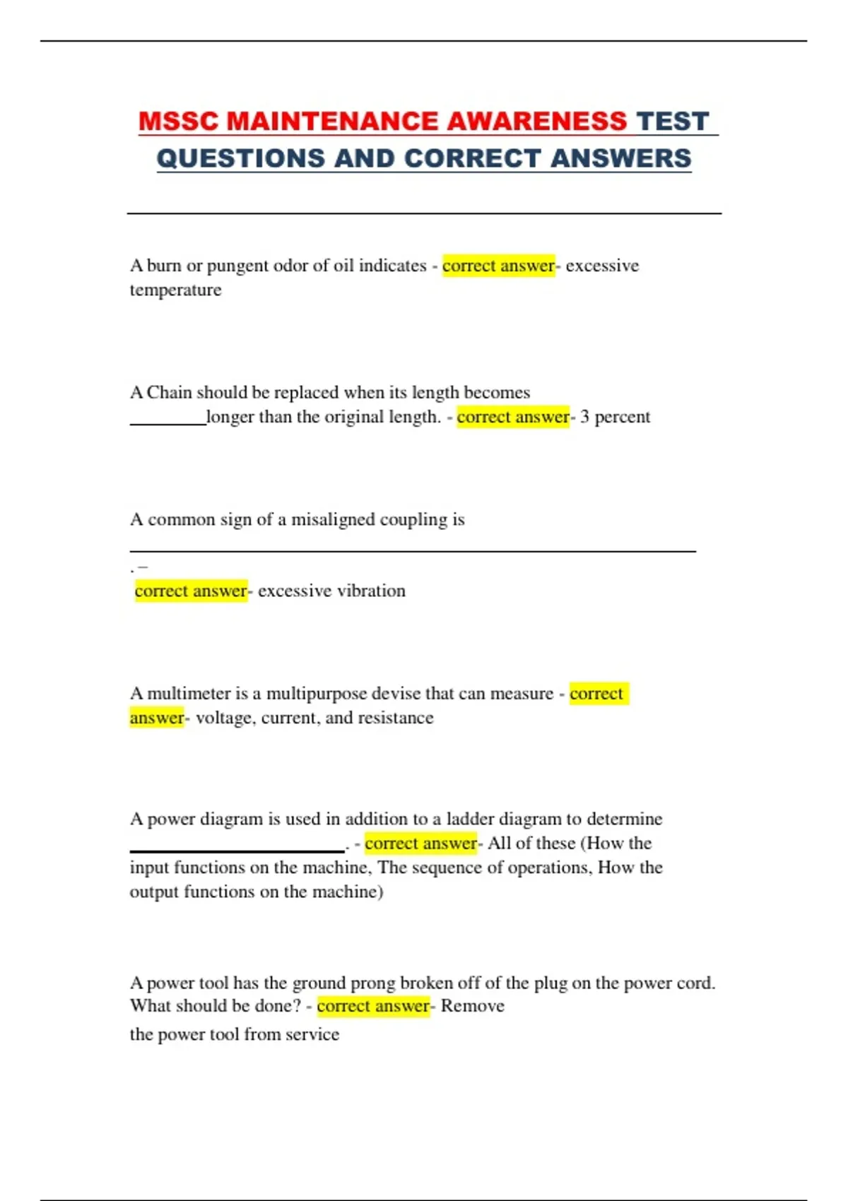 This document contains a full set of MSSC Maintenance Awareness test questions with their correct answers. It covers key topics such as preventive and predictive maintenance, shaft alignment, lubrication, bearings, hydraulics, electrical circuits, safety procedures, and workplace ergonomics. The material is designed to help students and professionals prepare for the MSSC exam by practicing with realistic question formats and verified answers.