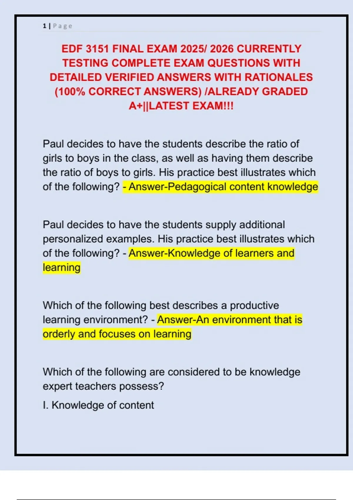 EDF 3151 FINAL EXAM 2025/ 2026 CURRENTLY TESTING COMPLETE EXAM QUESTIONS WITH DETAILED VERIFIED ANSWERS WITH RATIONALES (100% CORRECT ANSWERS) /ALREADY GRADED A+||LATEST EXAM!!!