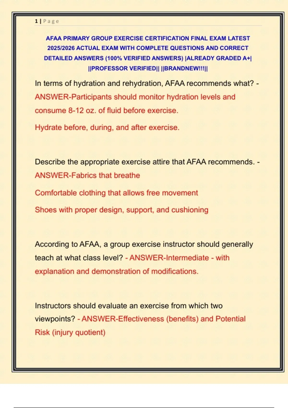 AFAA PRIMARY GROUP EXERCISE CERTIFICATION FINAL EXAM LATEST