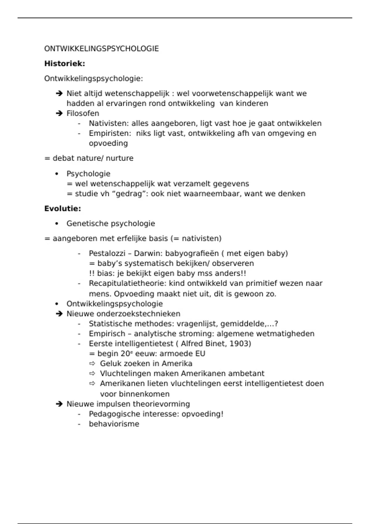 Deze samenvatting bevat alle hoofdstukken die tijdens het vak ontwikkelingspsychologie besproken worden. Ook zijn er veel voorbeelden aan toegevoegd zodat het eenvoudiger is om leerstof te begrijpen en onthouden. Extra oefeningen die in de lessen voor het examen werden gemaakt + de verbetering hiervan, zitten bij in dit document. Het is uitgebreid omschreven. Door deze samenvatting heb ik een 16 op 20 gehaald! Heel veel succes!