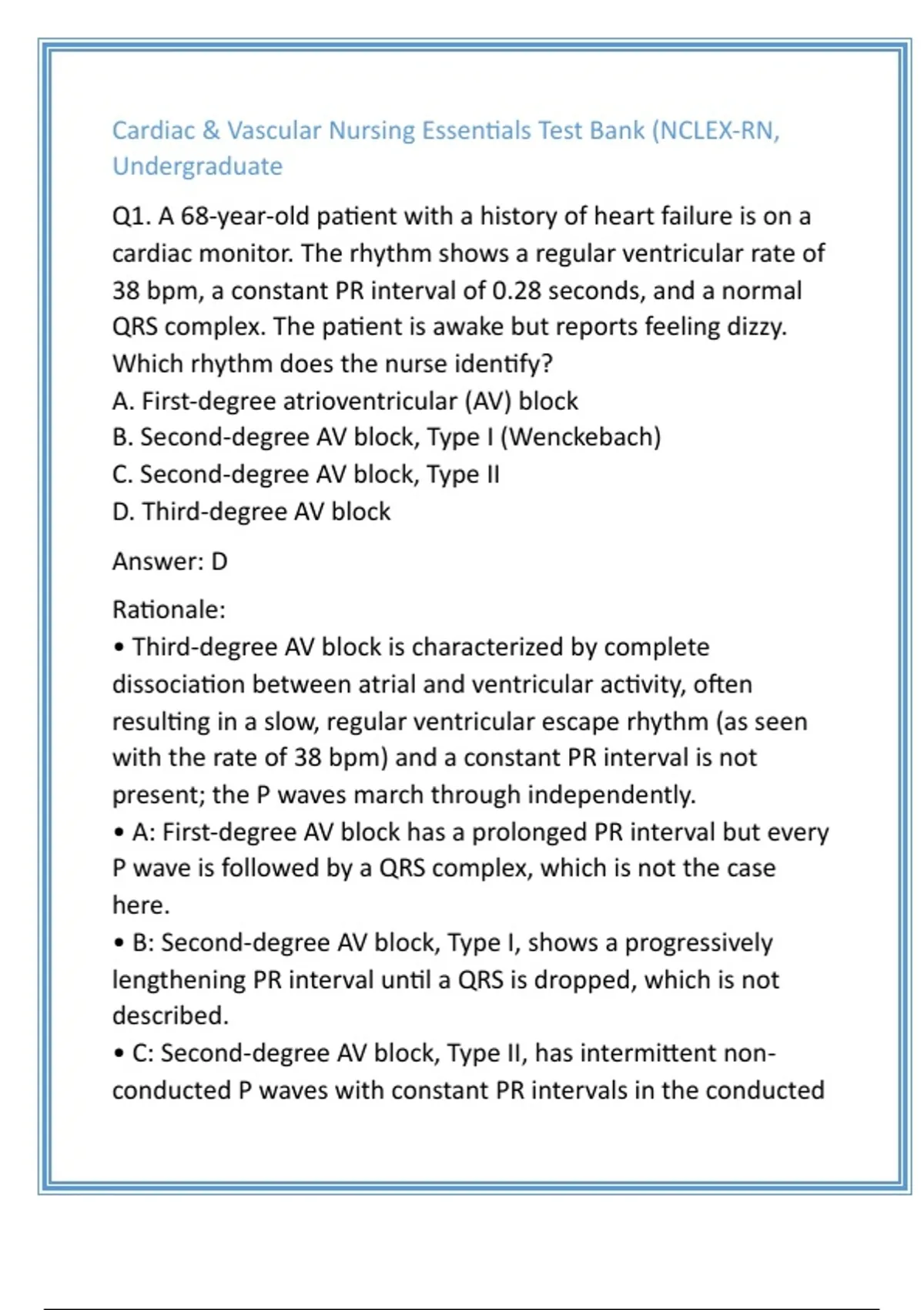 NCLEX-RN Cardiac & Vascular Nursing Essentials Test Bank: 400+ Practice Questions with Rationales 2. High SEO Description Master cardiac and vascular nursing for the NCLEX-RN with this comprehensive test bank of 400+ original multiple-choice questions. Developed by an expert cardiovascular nurse educator, this resource is meticulously aligned with the latest NCLEX-RN test plan categories—including Physiological Adaptation, Pharmacological Therapies, and Management of Care—to ensure your study is focused and effective. Each question features a detailed, evidence-based rationale explaining both correct and incorrect answers, reinforcing critical thinking for priority-setting, EKG interpretation, and acute condition management. Covering essential topics like dysrhythmias, acute coronary syndrome, heart failure, shock, and vascular disorders, this test bank is designed to build clinical judgment and confidence. With a mix of recall, application, and analysis questions, you can simulate the real exam experience and identify areas for improvement. Prepare to excel on the cardiovascular portion of the NCLEX and in your clinical practice. 3. 8 High SEO Keywords NCLEX-RN Cardiac Nursing Questions Cardiovascular NCLEX Practice Test Heart Failure NCLEX Questions EKG Interpretation Practice EKG Interpretation Practice NCLEX-RN Test Bank Cardiac Nursing Essentials Vascular Disorders NCLEX 4. 10 Hashtags #NCLEXRN #CardiacNursing #NursingTestBank #NCLEXPrep #HeartFailure #EKGInterpretation #NursingStudent #CardiovascularNursing #NCLEXQuestions #MedSurgNursing