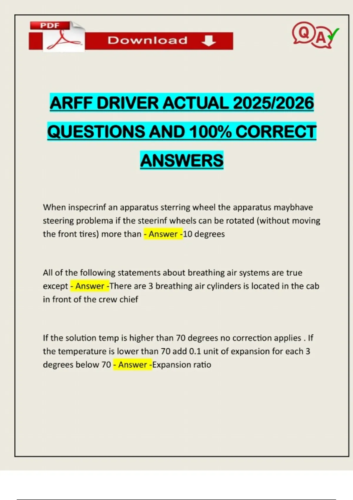 ARFF DRIVER ACTUAL 2025/2026 QUESTIONS AND 100% CORRECT ANSWERS