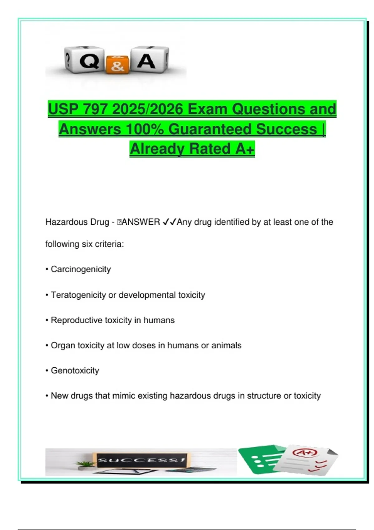 This comprehensive document contains 70 fully answered and up-to-date exam questions aligned with USP <797> guidelines, intended for the 2025/2026 academic year. It covers critical topics in sterile compounding and aseptic processing, making it an essential resource for pharmacy students and healthcare professionals preparing for academic exams, certification tests, or institutional training. Topics include: Classification and handling of hazardous drugs Risk levels (low, medium, high) and corresponding Beyond-Use Dates (BUD) ISO classifications and cleanroom design (ISO 5, 7, 8, 9) Environmental monitoring (viable and non-viable particles) Aseptic technique and media-fill testing Primary and secondary engineering controls (PECs, BSCs, CAIs) Hand hygiene, garbing sequence, and operator training Immediate-use CSPs, segregated compounding areas, and competency evaluation Regulations on 503B outsourcing facilities This document is highly relevant for: Doctor of Pharmacy (PharmD) students BS in Pharmaceutical Sciences students Certified Pharmacy Technician (CPhT) candidates (PTCB, NHA, ExCPT) Healthcare professionals working in hospital and outpatient sterile compounding areas Residency applicants and continuing education participants in clinical or regulatory pharmacy The content supports the curriculum of U.S.-based pharmacy programs, including those at the University of Michigan, University of Florida, University of North Carolina, and other institutions that follow USP and FDA sterile compounding guidelines. Each question is structured to reinforce compliance with aseptic and quality assurance practices critical for patient safety in compounding environments. Keywords: USP 797, sterile compounding, aseptic technique, beyond-use dating, CSP risk levels, ISO cleanroom standards, pharmacy technician exam, media fill test, hazardous drugs, PEC cleaning frequency, buffer area, glove fingertip test, pharmacy board exam prep, parenteral nutrition, 503B outsourcing