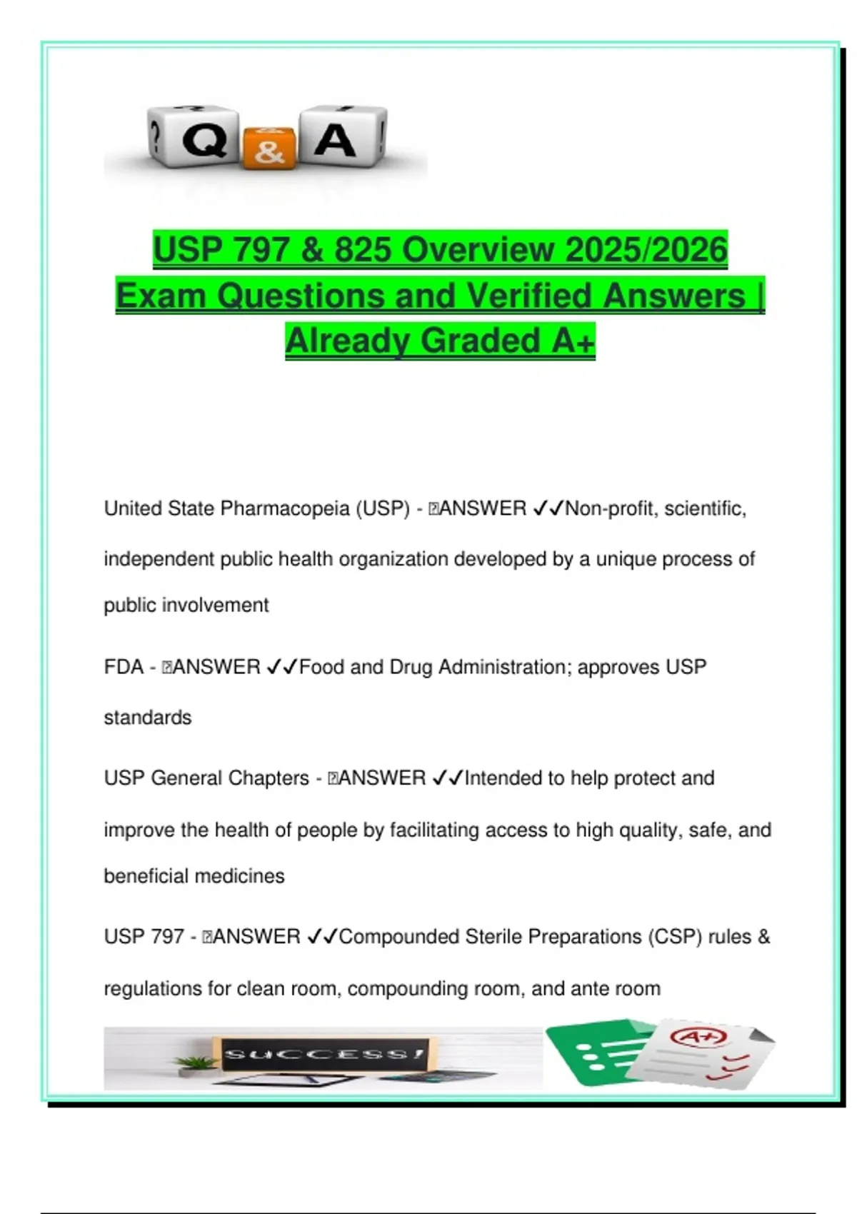 This document contains 50 verified exam questions with correct answers based on USP <797> and USP <825> standards, covering the latest updates relevant for the 2025/2026 academic cycle. It is ideal for students and professionals seeking a clear, accurate overview of sterile compounding practices and radiopharmaceutical procedures, along with essential regulatory knowledge. The USP <797> section focuses on: Risk levels for CSPs (low, medium, high) ISO class environments (5, 7, 8) for cleanrooms and compounding areas Aseptic technique, garbing procedures, HEPA filtration, and laminar airflow hoods Media-fill testing, fingertip sampling, and microbial contamination thresholds Beyond-Use Dating (BUD), hand hygiene, and immediate-use exceptions The USP <825> section introduces: Radiopharmaceutical preparation, compounding, and dispensing protocols Specialized environments such as hot labs and Segregated Radiopharmacy Processing Areas (SRPAs) Use of lead shielding (lead pigs), PET imaging materials, and safety standards for radioactive medications This resource is best suited for: PharmD students focusing on clinical, compounding, or nuclear pharmacy BS in Pharmaceutical Sciences students Pharmacy technician certification candidates (PTCB, NHA, ExCPT) Professionals in radiopharmacy, nuclear medicine, or hospital sterile compounding environments The material supports learning at institutions following USP and FDA standards, including top-tier U.S. pharmacy schools like the University of Michigan, University of Florida, and University of North Carolina. It’s a perfect blend of sterile compounding fundamentals and radiopharmacy-specific protocols for academic and professional exam preparation. Keywords: USP 797, USP 825, sterile compounding, radiopharmaceuticals, ISO classifications, CSP risk levels, aseptic technique, laminar airflow hood, media-fill test, BUD, HEPA filter, PET imaging, lead pigs, SOP, nuclear pharmacy, pharmacy board exam