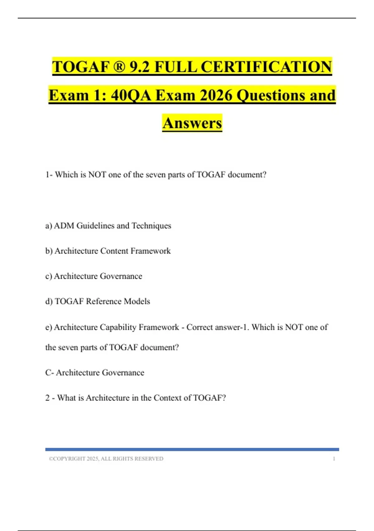 TOGAF ® 9.2 FULL CERTIFICATION Exam 1: 40QA Exam 2026 Questions and Answers