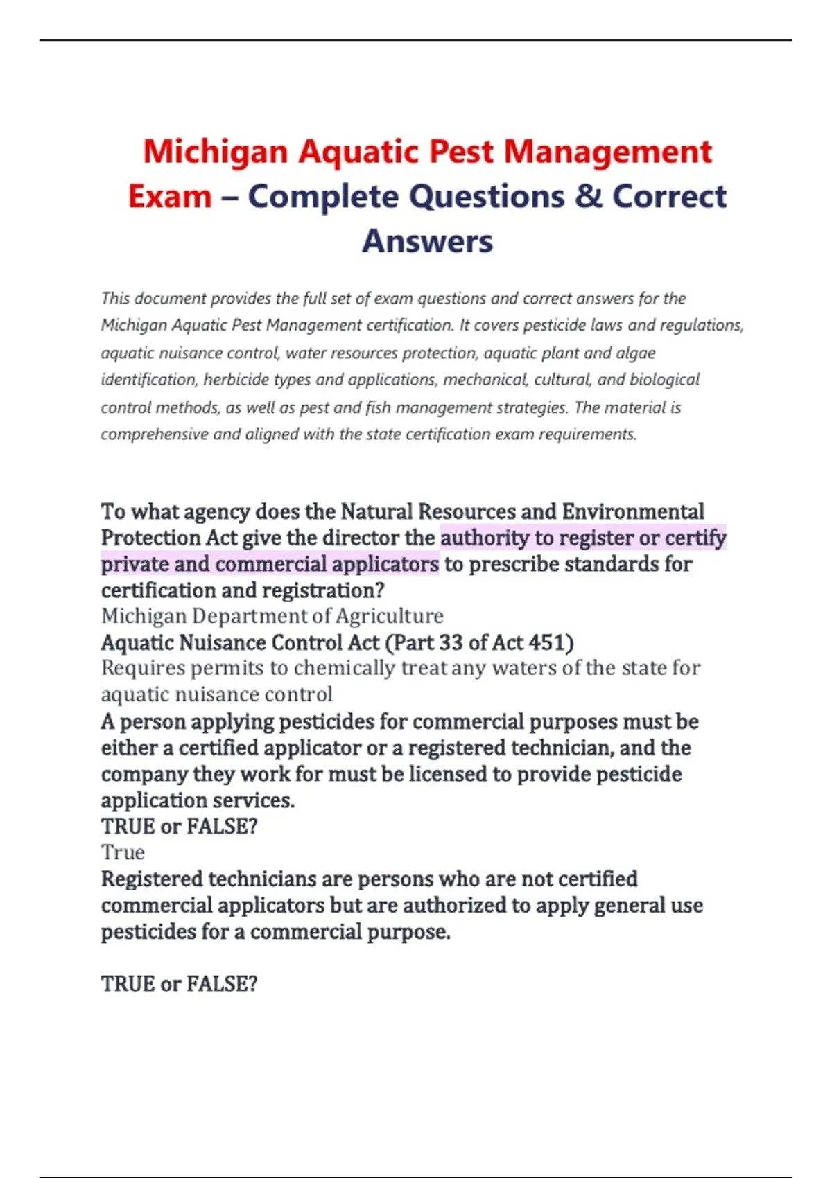 Michigan Aquatic Pest Management Exam – Complete Questions & Correct Answers