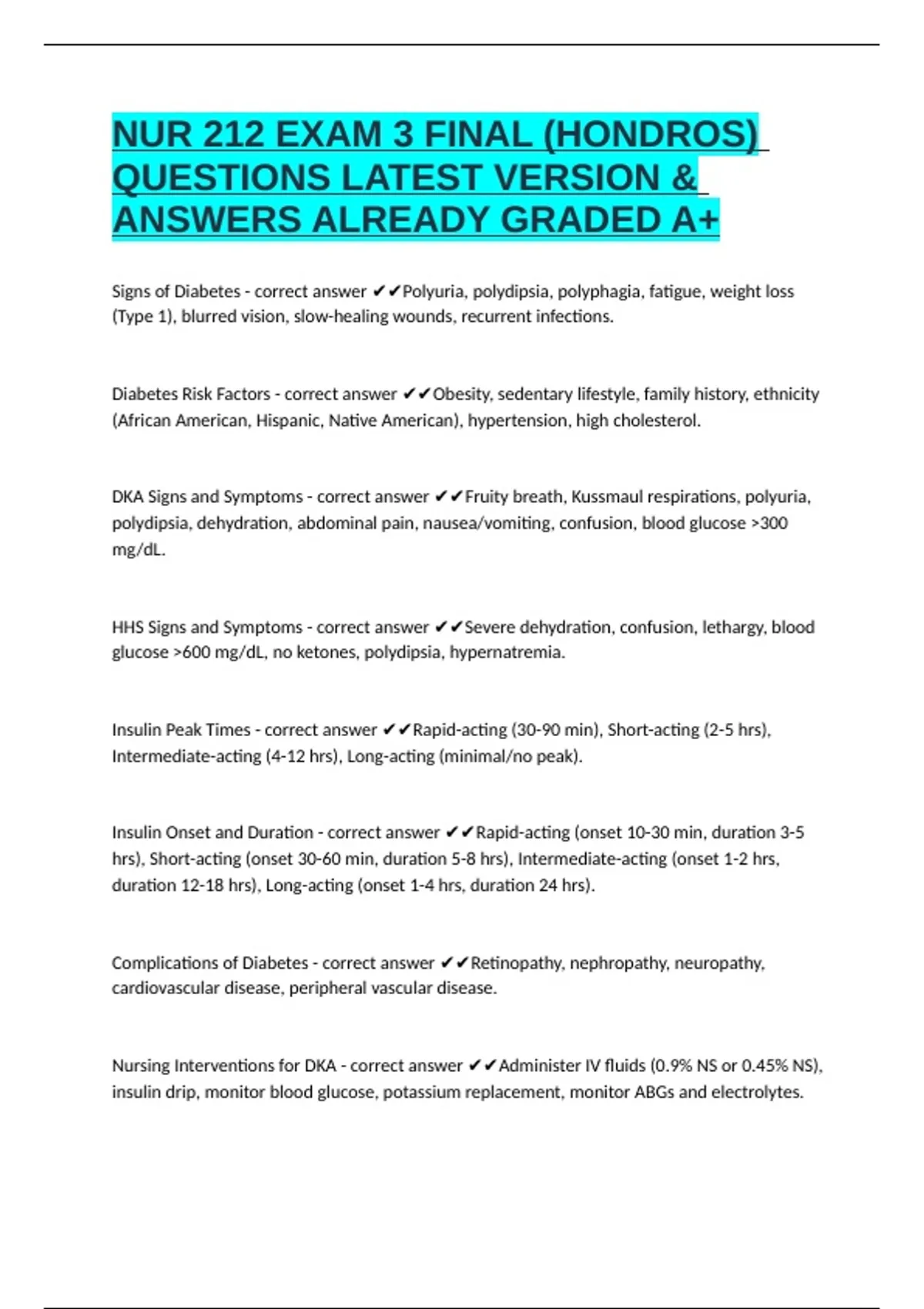 ,Nursing Interventions for HHS - correct answer ✔✔Administer IV fluids, insulin drip, monitor