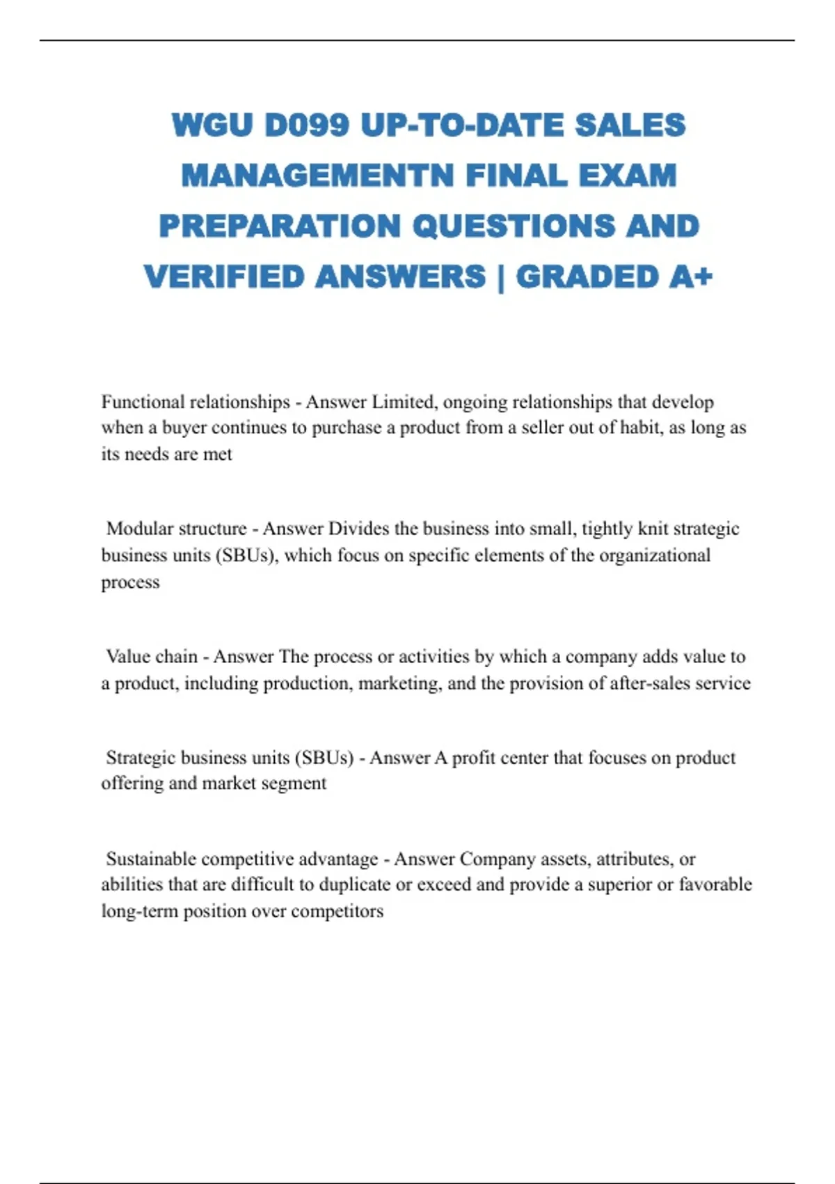 WGU D099 UP-TO-DATE SALES MANAGEMENTN FINAL EXAM PREPARATION QUESTIONS AND VERIFIED ANSWERS | GRADED A+