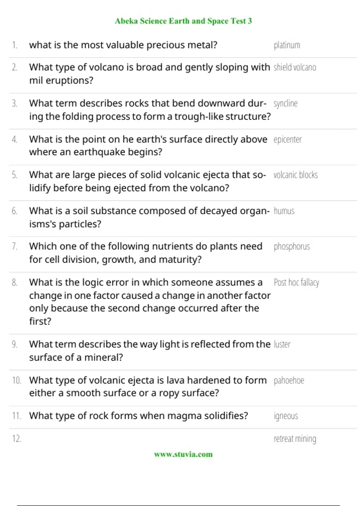 11. What type of rock forms when magma solidifies? igneous