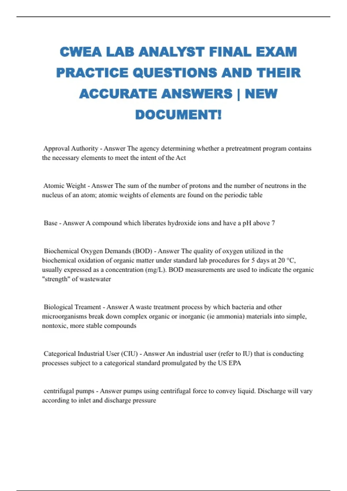 CWEA LAB ANALYST FINAL EXAM PRACTICE QUESTIONS AND THEIR ACCURATE ANSWERS | NEW DOCUMENT!