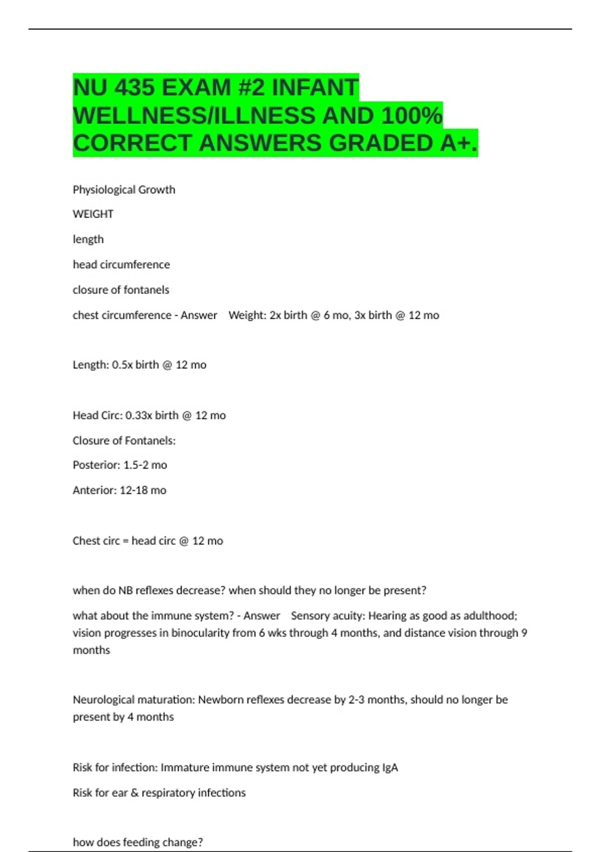 NU 435 EXAM #2 INFANT WELLNESS/ILLNESS AND 100% CORRECT ANSWERS GRADED A+.