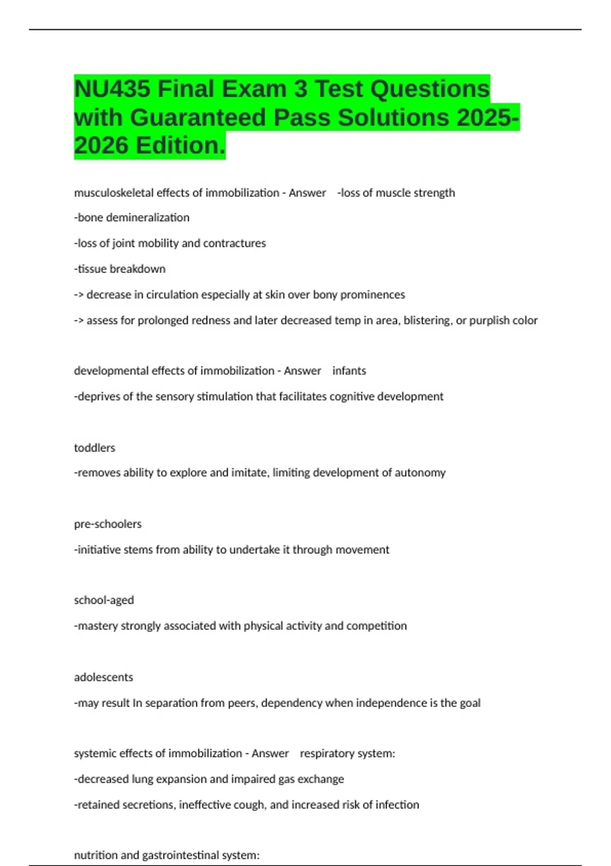 systemic effects of immobilization - Answer respiratory system: