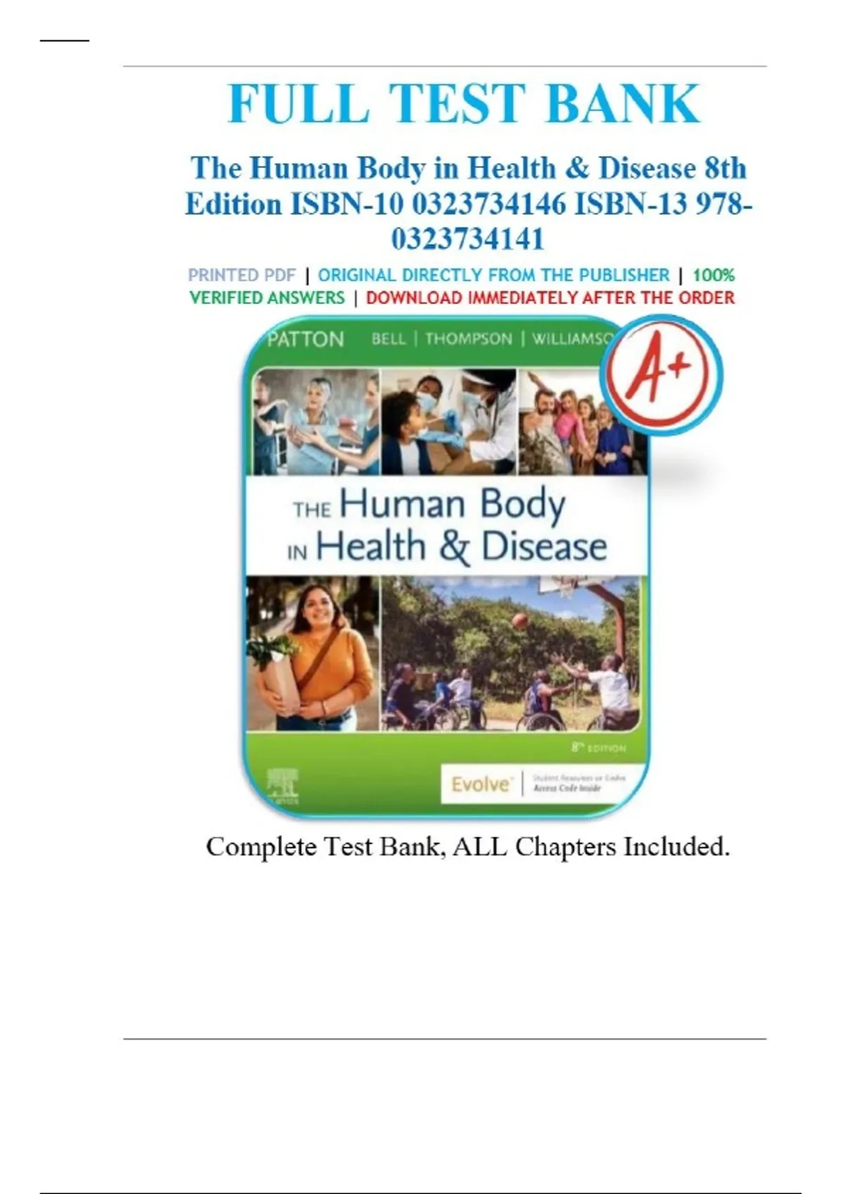 Test Bank For The Human Body in Health & Disease 8th Edition By Kevin T. Patton; Frank Bell; Terry Thompson; Peggie Williamson | | 9780323734165 | Chapter 1-25 | Complete Questions And Answers A+