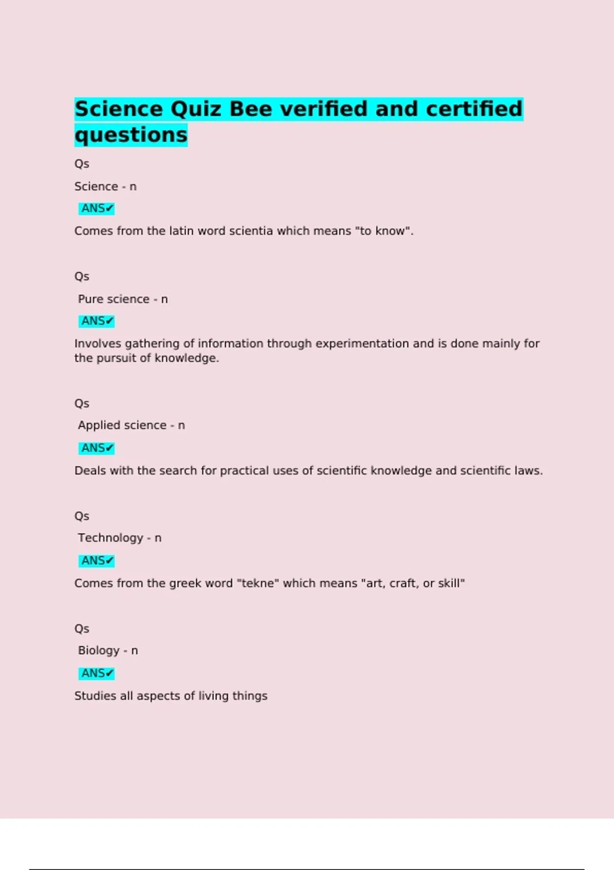 Science Quiz Bee verified and certified questions Qs Science - n ANS Comes from the latin word scientia which means "to know". Qs Pure science - n ANS Involves gathering of information through experimentation and is done mainly for the pursuit of knowledge. Qs Applied science - n ANS Deals with the search for practical uses of scientific knowledge and scientific laws. Qs Technology - n ANS Comes from the greek word "tekne" which means "art, craft, or skill" Qs Biology - n ANS Studies all aspects of living things