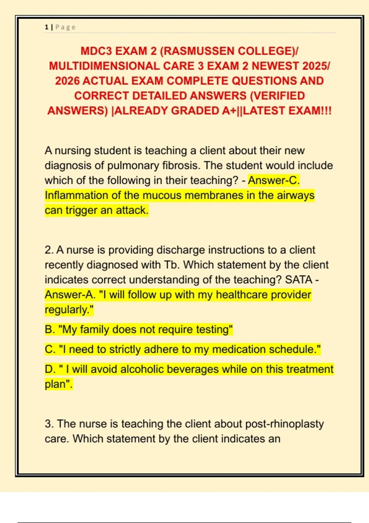 MDC3 EXAM 2 (RASMUSSEN COLLEGE)/ MULTIDIMENSIONAL CARE 3 EXAM 2 NEWEST 2025/ 2026 ACTUAL EXAM COMPLETE QUESTIONS AND CORRECT DETAILED ANSWERS (VERIFIED ANSWERS) |ALREADY GRADED A+||LATEST EXAM!!!