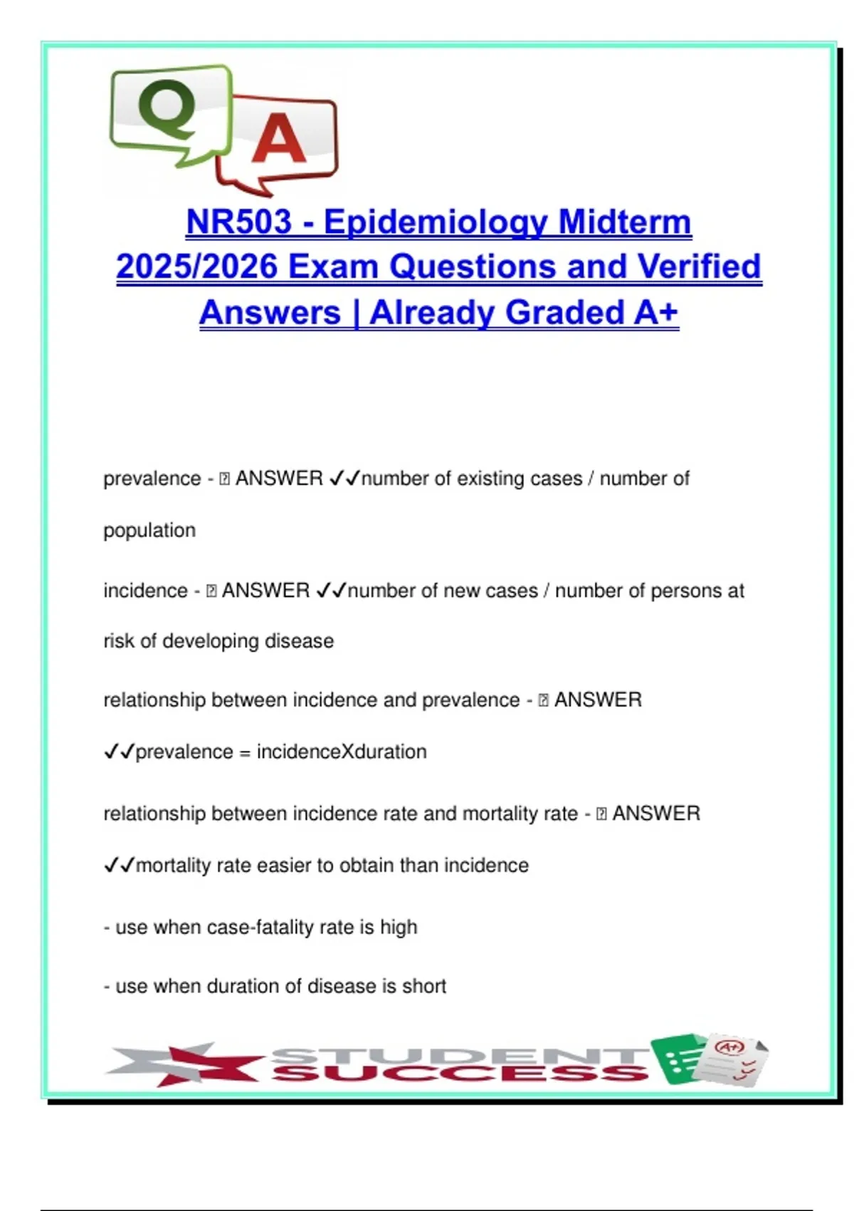 This document includes 40+ verified midterm exam questions and correct answers for the NR-503 Epidemiology course, tailored for the 2025/2026 academic year at Chamberlain University. It is specifically designed to support student success by offering accurate, well-organized exam preparation materials reflecting the current curriculum. Key topics covered include: – Epidemiological measurements: prevalence, incidence, relative risk, mortality rate, case fatality – Disease surveillance methods: active and passive surveillance, outbreak detection, epidemic curves – Transmission modes: direct vs. indirect, single vs. common-vehicle exposure – Immunity types: herd immunity, clinical vs. subclinical disease, latent infections – Screening principles: sensitivity, specificity, validity – Key epidemiologic models and terms such as incubation periods, attack rate, endemic vs. epidemic, and risk assessment Each concept is presented in concise Q&A format, allowing for rapid review and deep understanding of public health principles and applied epidemiology. This document is ideal for: – Students in Advanced Practice Nursing (APN), Master of Public Health (MPH), Doctor of Nursing Practice (DNP), or other graduate health programs – Learners preparing for midterms, certification exams, or licensure assessments – Healthcare professionals seeking a clear and focused review of epidemiological methods and metrics Whether you're preparing for a high-stakes exam or refreshing your epidemiology knowledge, this document delivers essential content aligned with national public health education standards. Keywords: epidemiology, NR-503, midterm exam, prevalence, incidence, surveillance, risk calculations, relative risk, mortality rate, sensitivity, specificity, herd immunity, transmission modes, passive surveillance, active surveillance, epidemic curve, public health, clinical disease, subclinical disease, Chamberlain University