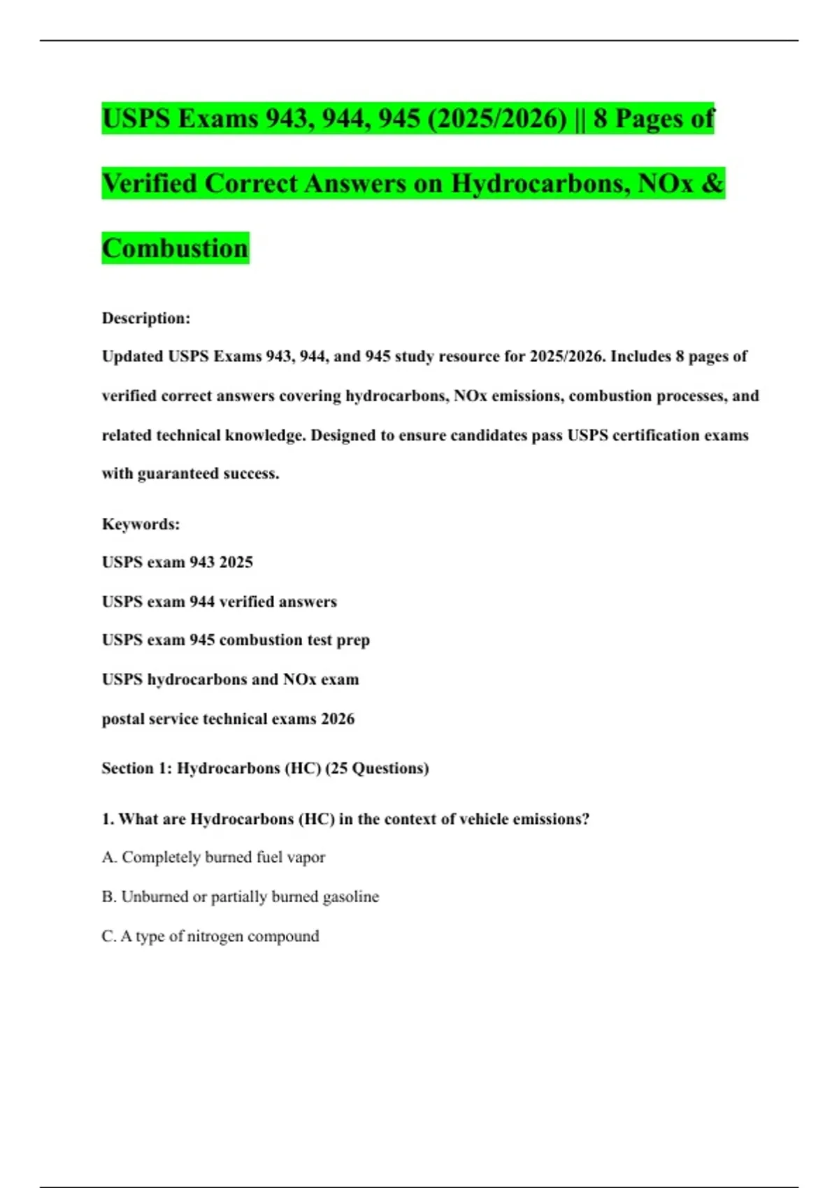 USPS Exams 943, 944, 945 (2025/2026) || 8 Pages of Verified Correct Answers on Hydrocarbons, NOx & Combustion Description: Updated USPS Exams 943, 944, and 945 study resource for 2025/2026. Includes 8 pages of verified correct answers covering hydrocarbons, NOx emissions, combustion processes, and related technical knowledge. Designed to ensure candidates pass USPS certification exams with guaranteed success. Keywords: USPS exam 943 2025 USPS exam 944 verified answers USPS exam 945 combustion test prep USPS hydrocarbons and NOx exam postal service technical exams 2026
