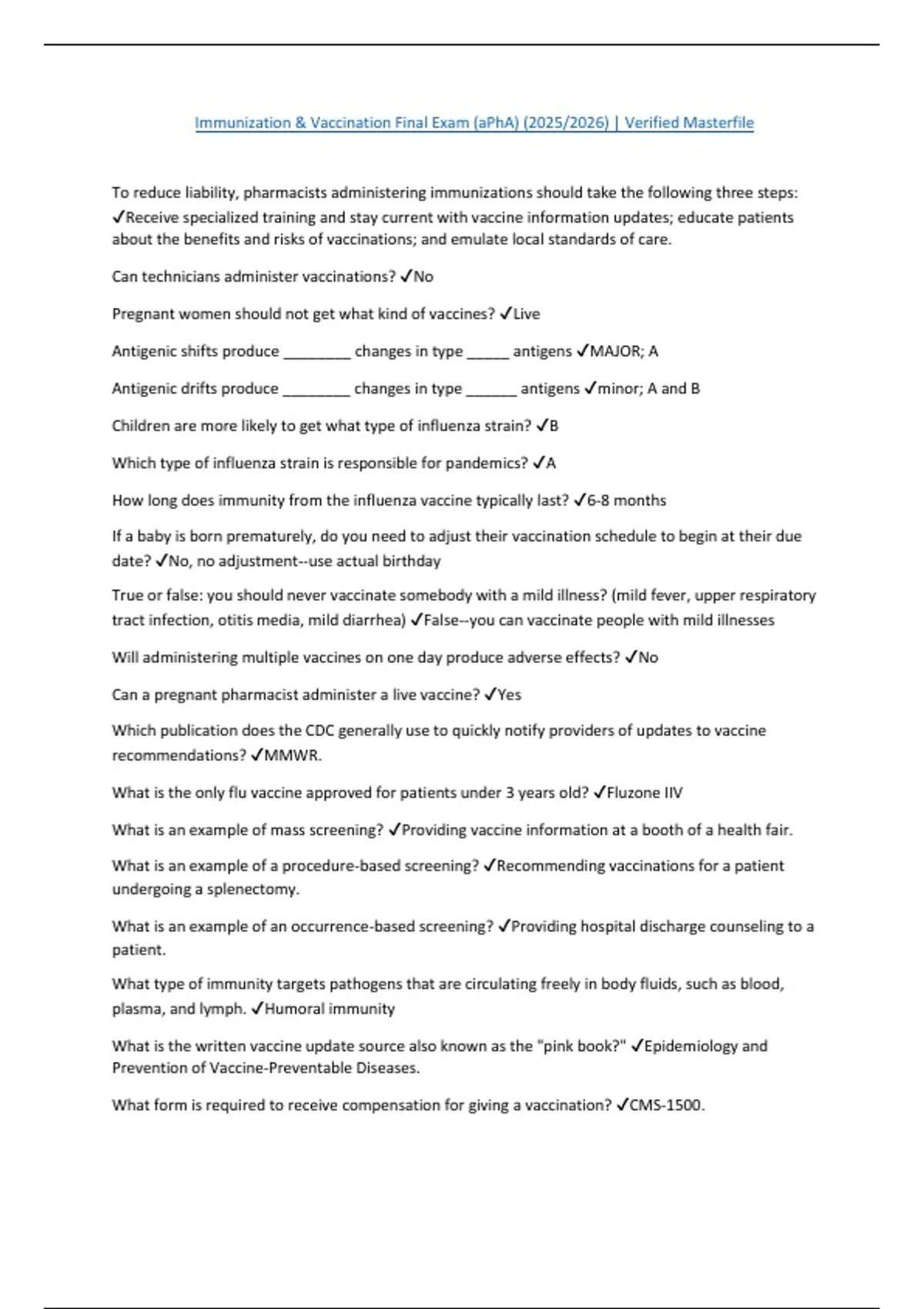 Immunization & Vaccination Final Exam (aPhA) (2025/2026) | Verified Masterfile