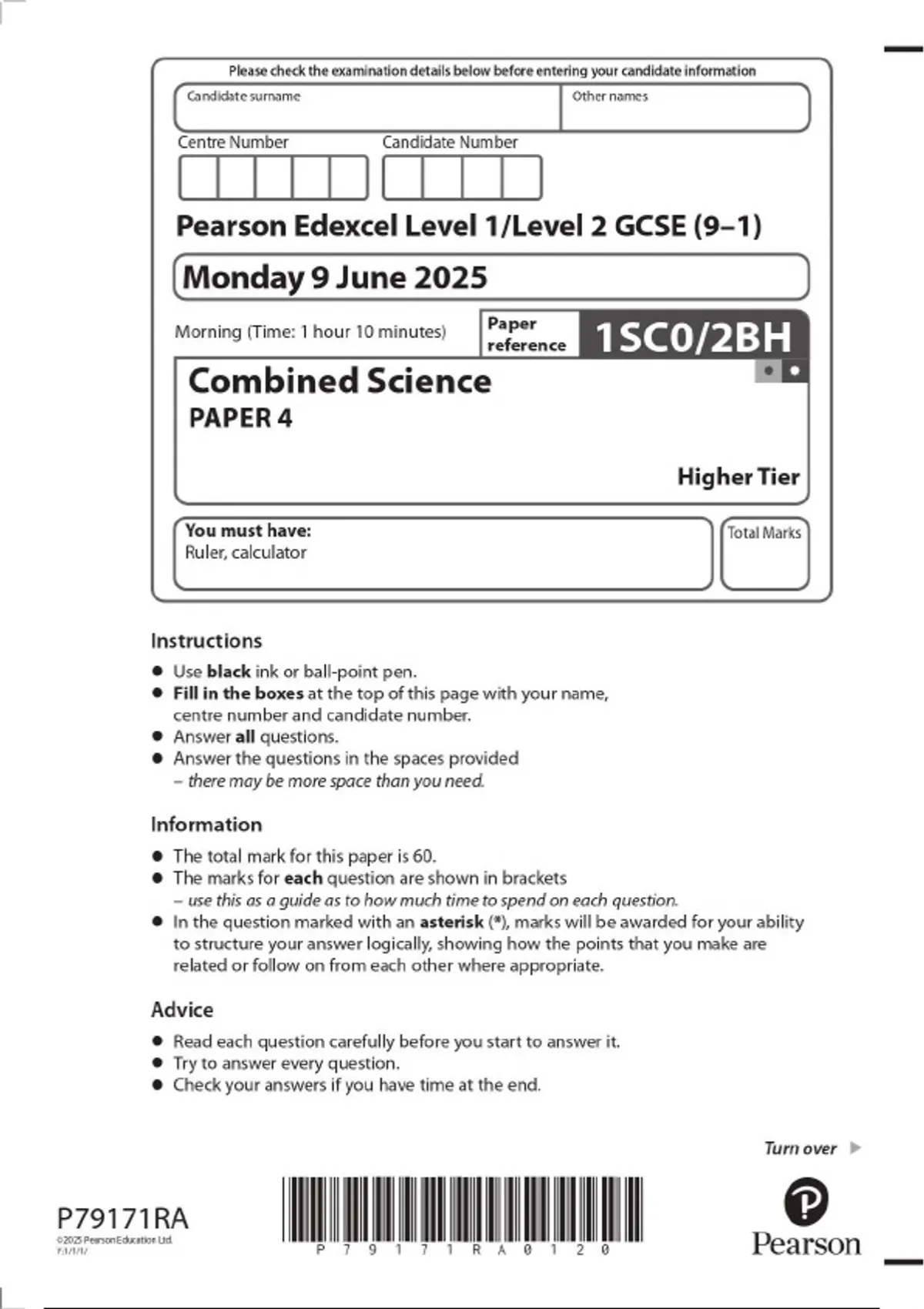 2025 Pearson Edexcel Level 1/Level 2 GCSE. 1SC0/2BH Combined Science PAPER 4 2025 Pearson Edexcel Level 1/Level 2 GCSE. 1SC0/2BH Combined Science PAPER 4 Higher Tier