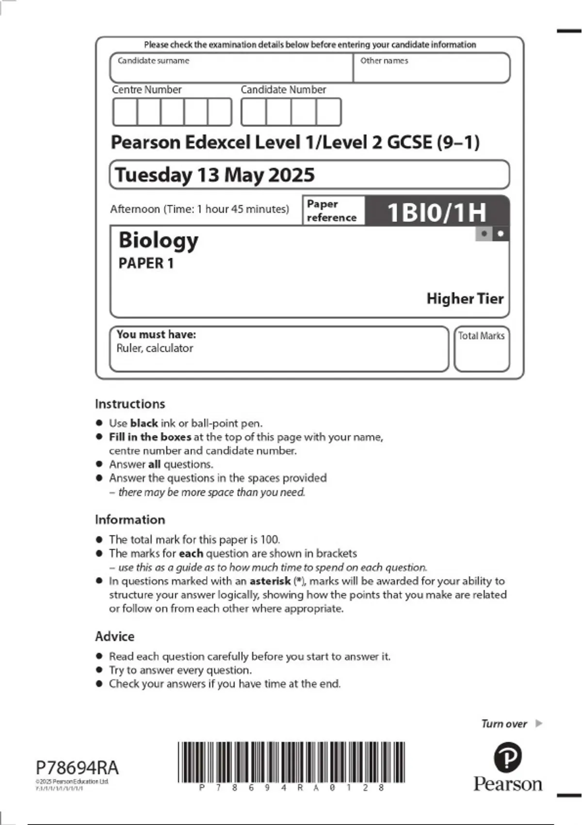2025 Pearson Edexcel Level 1/Level 2 GCSE. 1BI0/1H Biology PAPER 1 Higher Tier 2025 Pearson Edexcel Level 1/Level 2 GCSE. 1BI0/1H Biology PAPER 1 Higher Tier