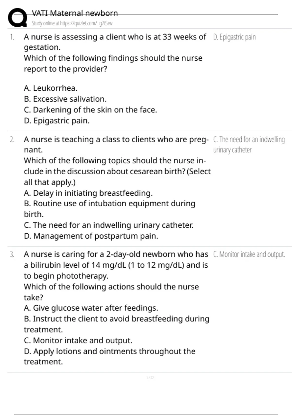 1. A nurse is assessing a client who is at 33 weeks of D. Epigastric pain