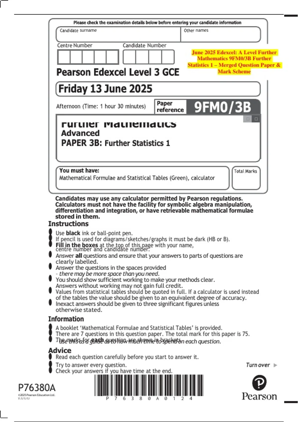 booklet ‘Mathematical Formulae and Statistical Tables’ is provided.