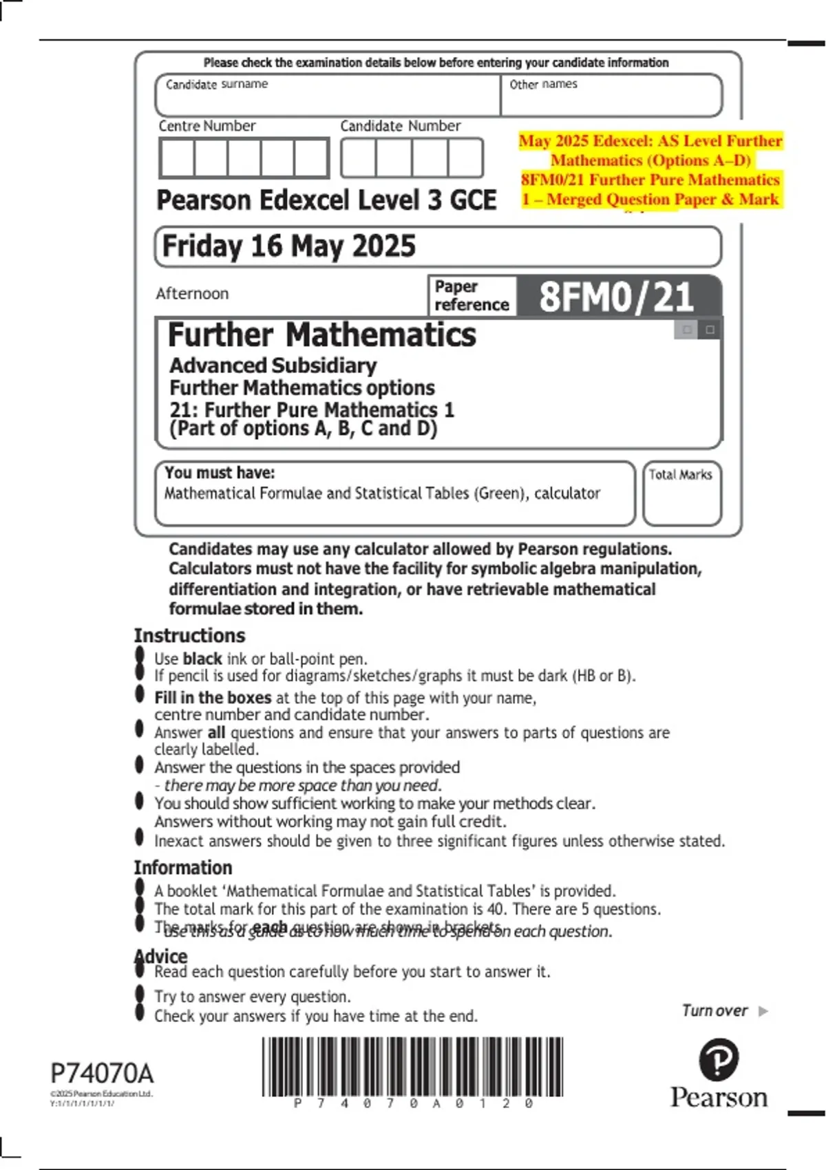 May 2025 Edexcel: AS Level Further Mathematics (Options A–D) 8FM0/21 Further Pure Mathematics 1 – Merged Question Paper & Mark Scheme