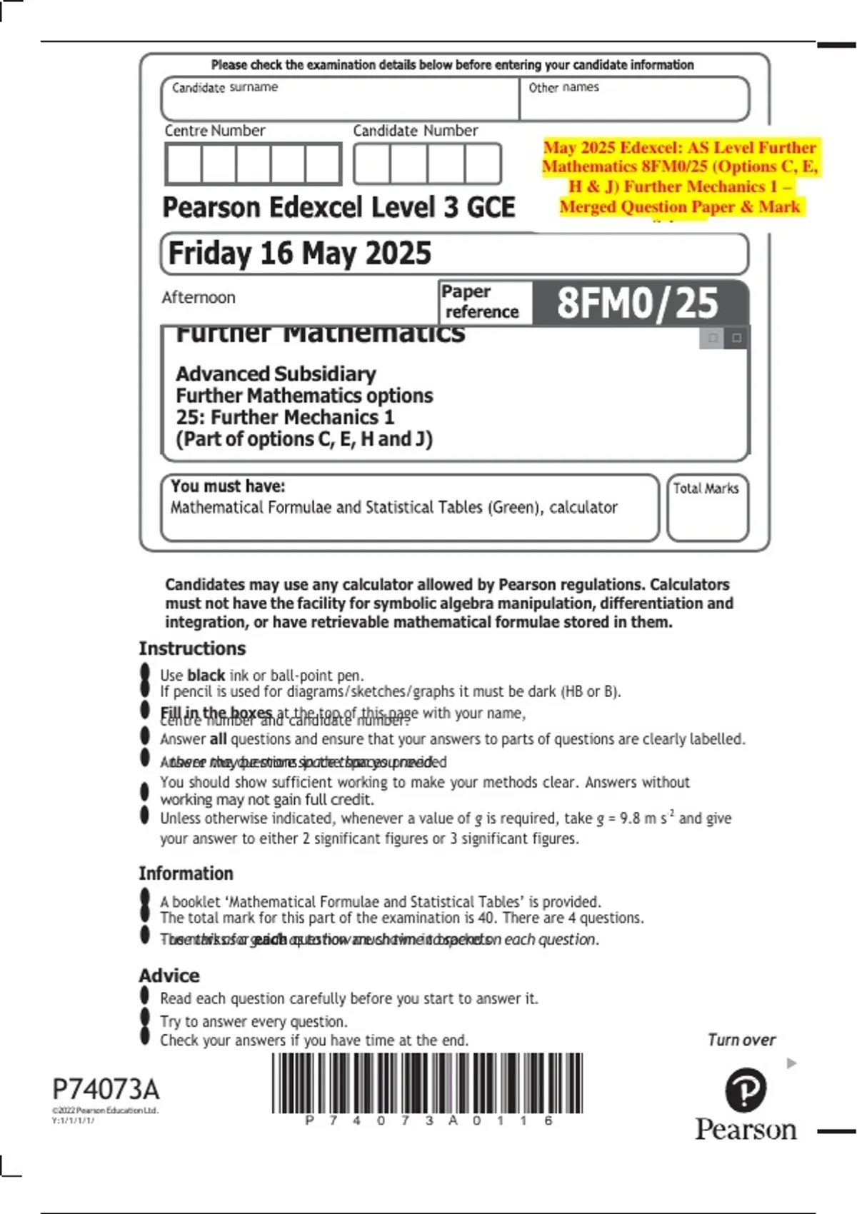 Candidates may use any calculator allowed by Pearson regulations. Calculators