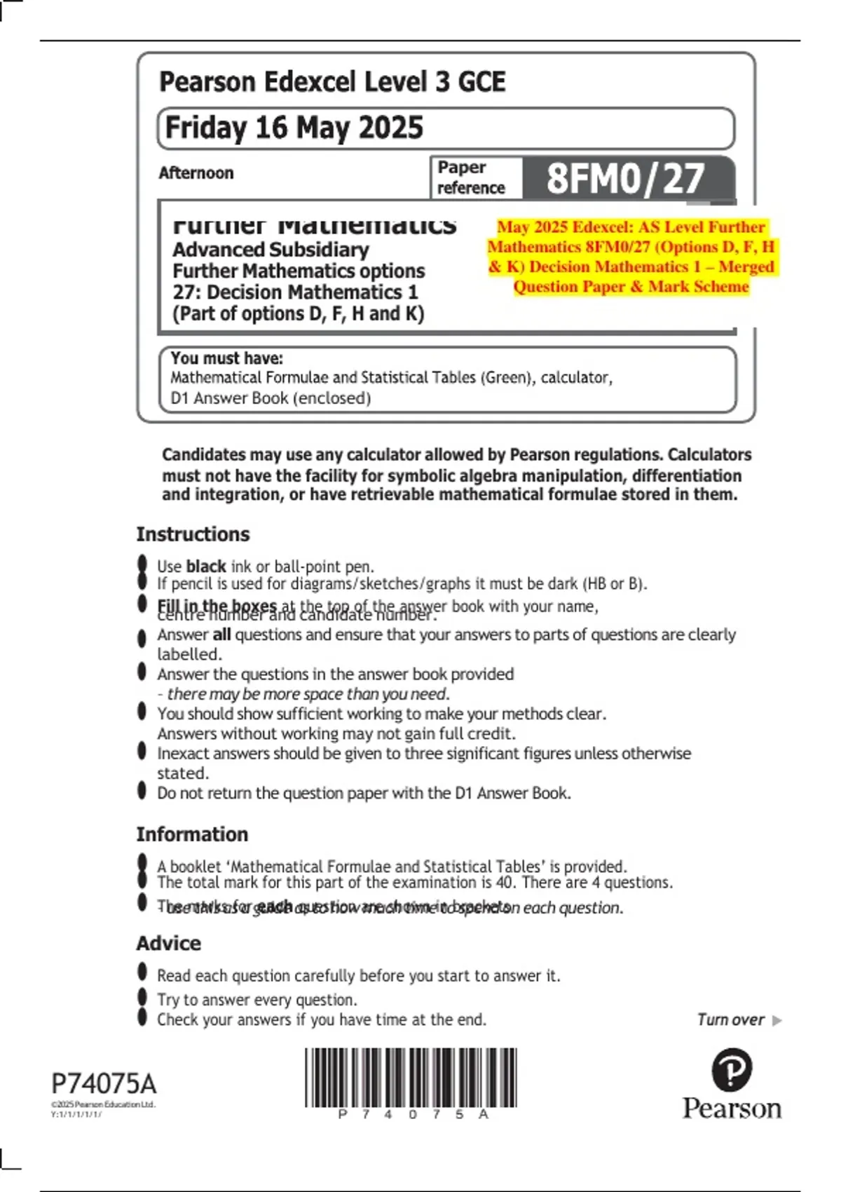Further Mathematics May 2025 Edexcel: AS Level Further