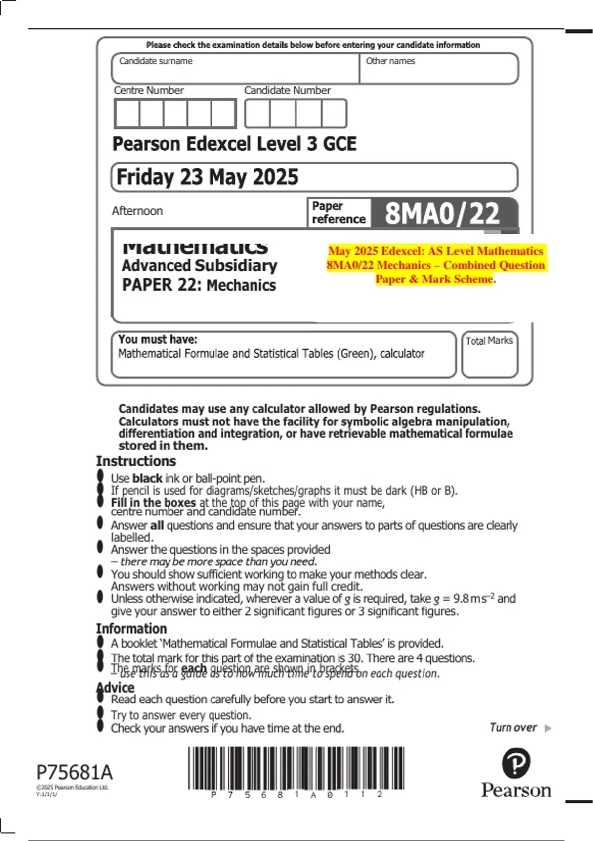 PAPER 22: Mechanics Paper & Mark Scheme.