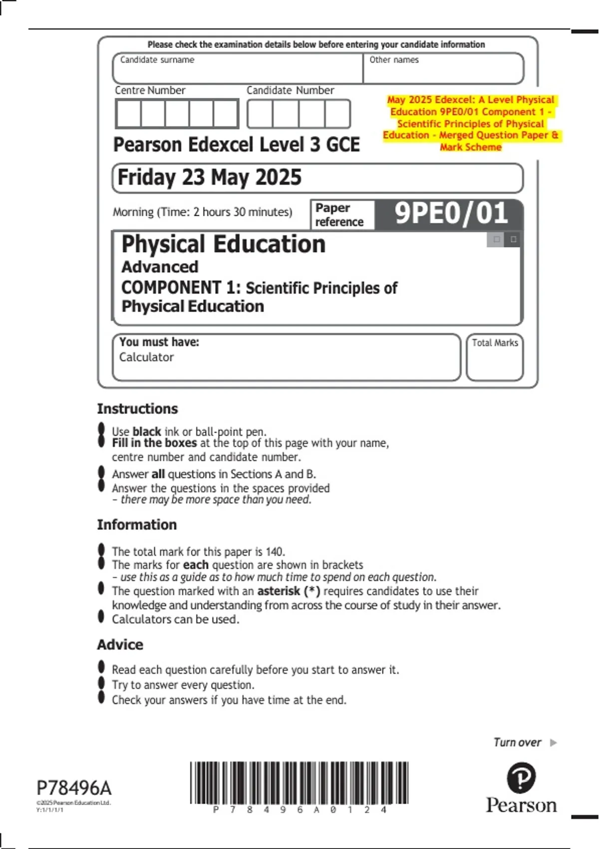 May 2025 Edexcel: A Level Physical Education 9PE0/01 Component 1 – Scientific Principles of Physical Education – Merged Question Paper & Mark Scheme