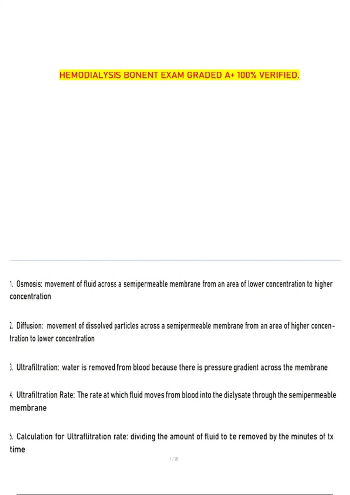 This document contains a 100% verified collection of Hemodialysis BONENT exam questions with fully graded A+ answers. It covers essential dialysis topics including hemodialysis principles, water treatment systems, patient assessment, safety protocols, and nephrology clinical practices. The material is designed to provide accurate explanations and reliable support for certification preparation.