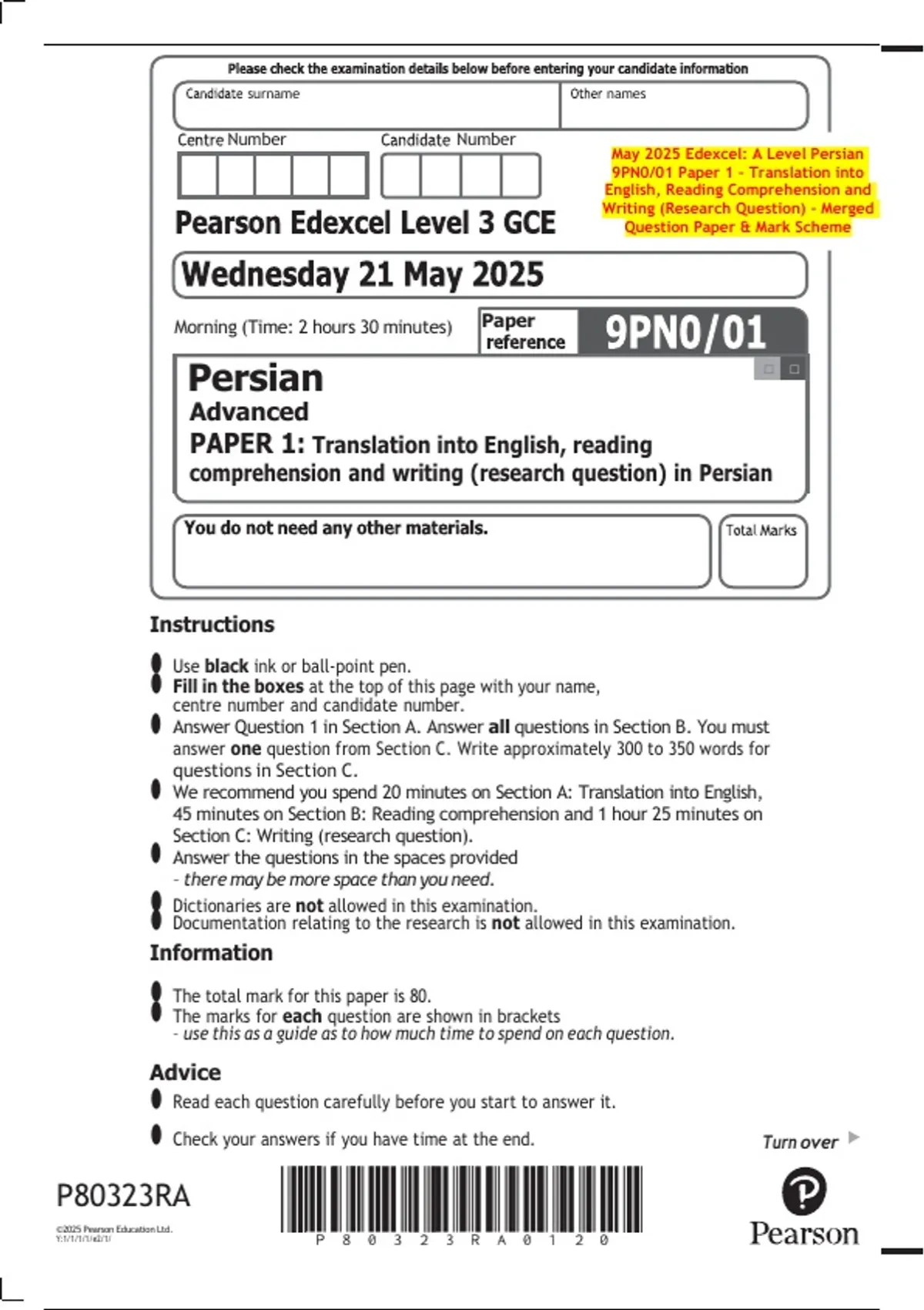 May 2025 Edexcel: A Level Persian 9PN0/01 Paper 1