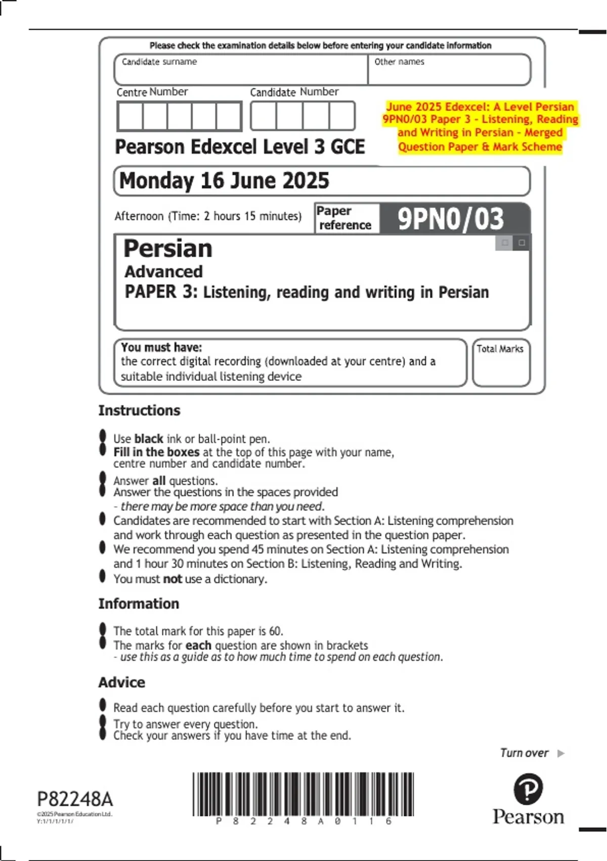 June 2025 Edexcel: A Level Persian 9PN0/03 Paper 3 – Listening, Reading and Writing in Persian – Merged Question Paper & Mark Scheme