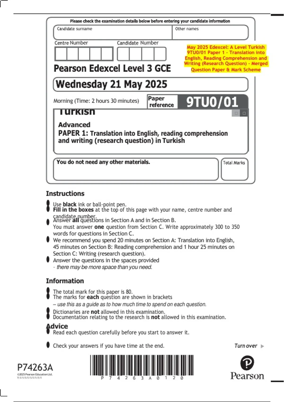 May 2025 Edexcel: A Level Turkish