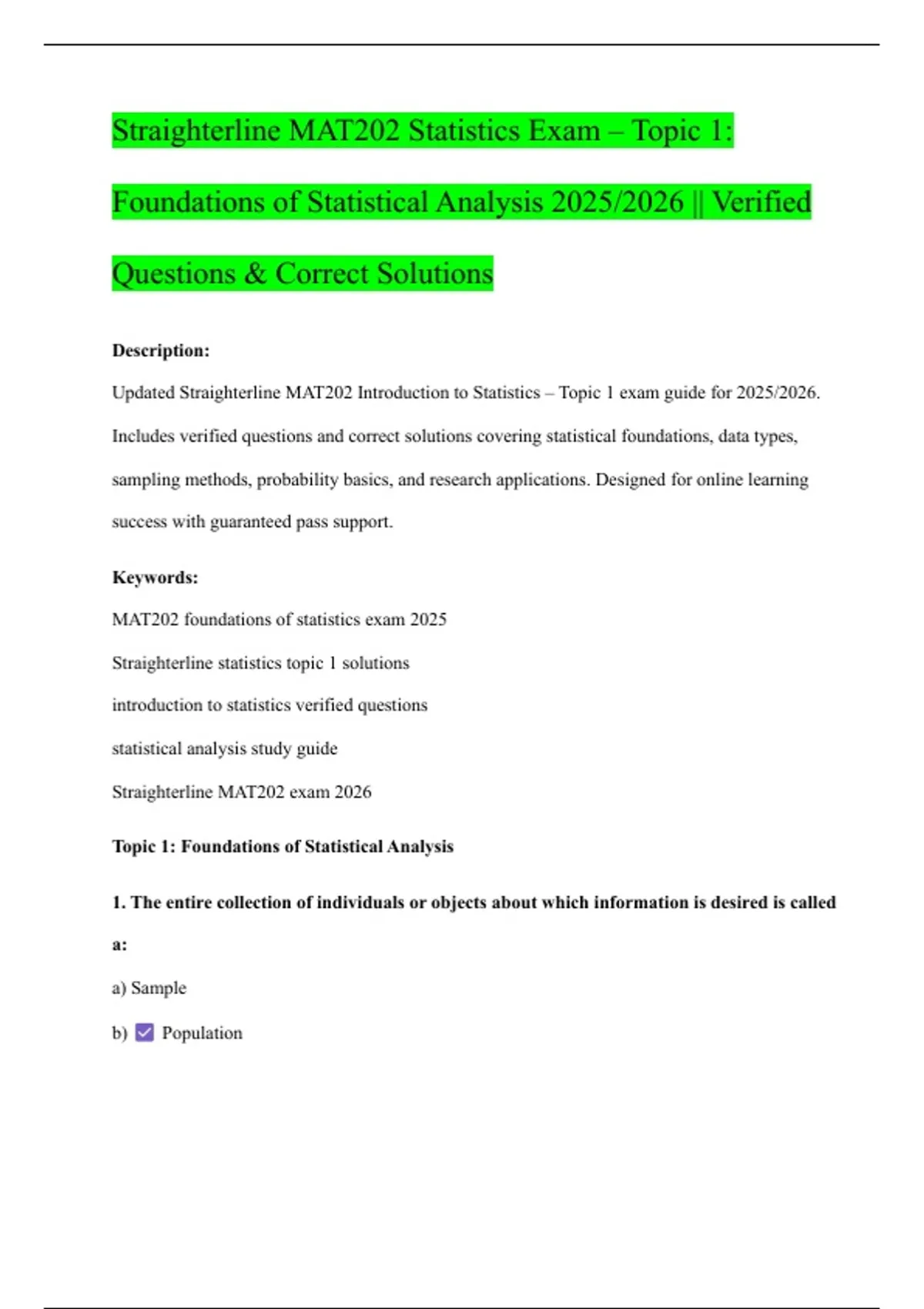 Updated Straighterline MAT202 Introduction to Statistics – Topic 1 exam guide for 2025/2026.