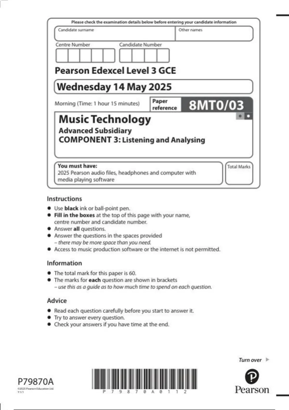 Pearson Edexcel Level 3 GCE 8MT0/03 Music Technology Advanced Subsidiary COMPONENT 3: Listening and Analysing June 2025