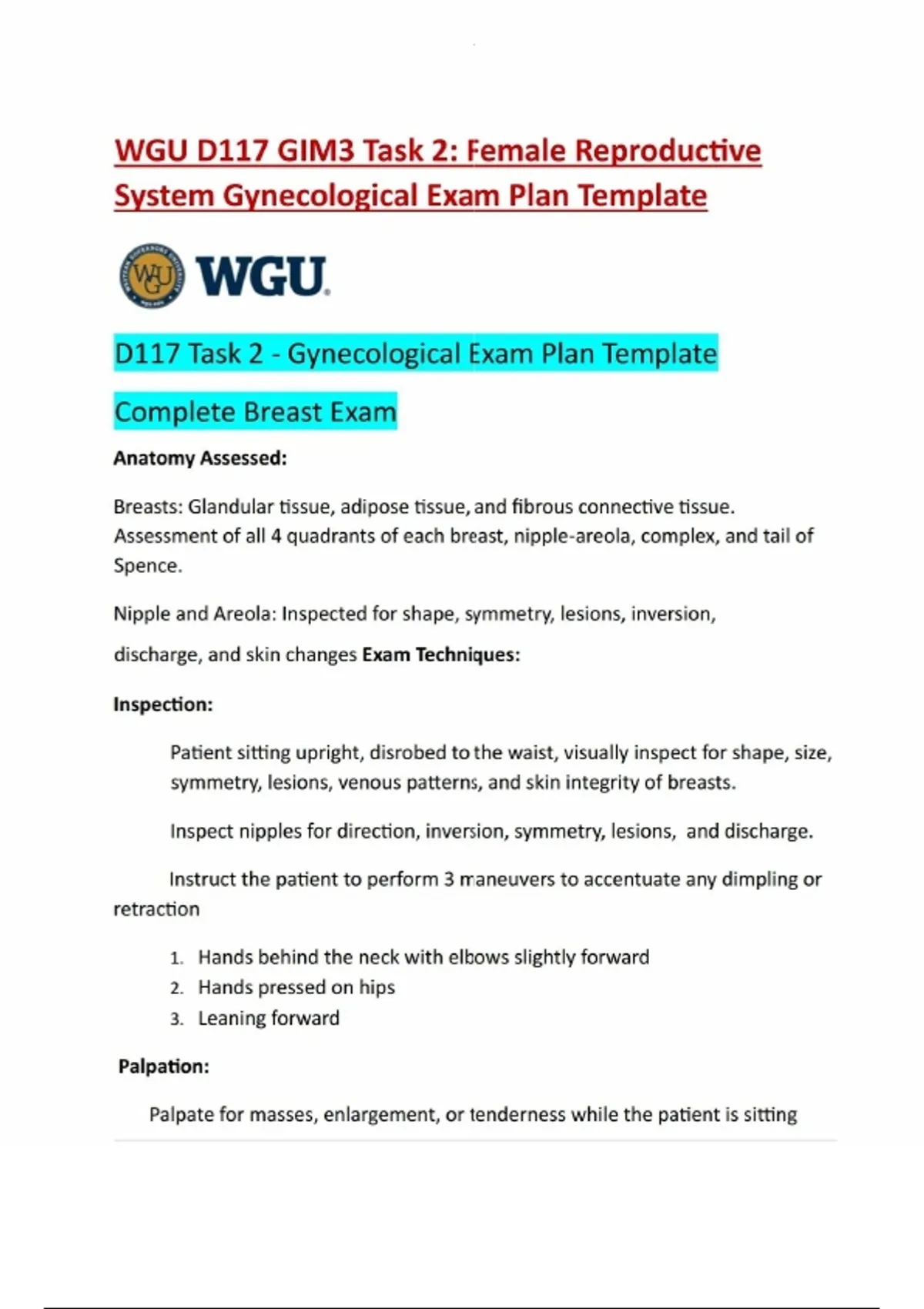 WGU D117 GIM3 Task 2 / Female Reproductive System Gynecological Exam Plan Template/ D117 Task 2 - Gynecological Exam Plan Template Complete Breast Exam/Latest Updated A+ Score Solution