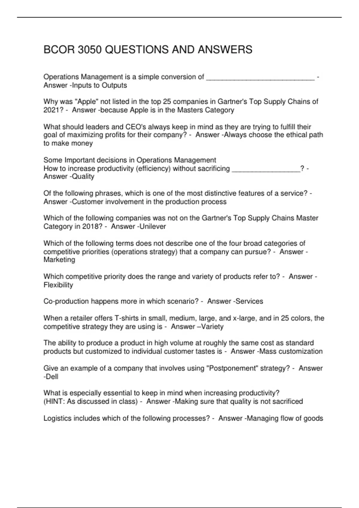 BCOR 3050 QUESTIONS AND ANSWERS