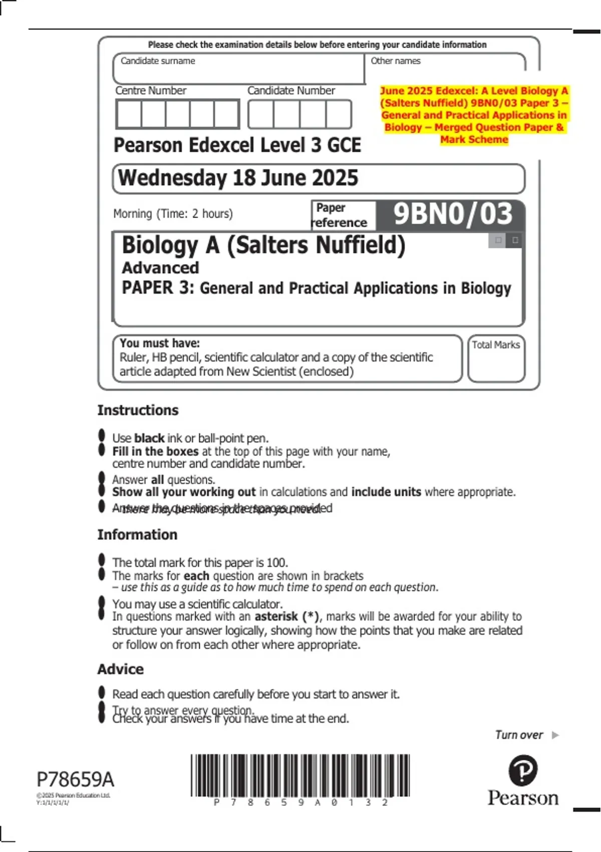 Centre Number Candidate Number June 2025 Edexcel: A Level Biology A