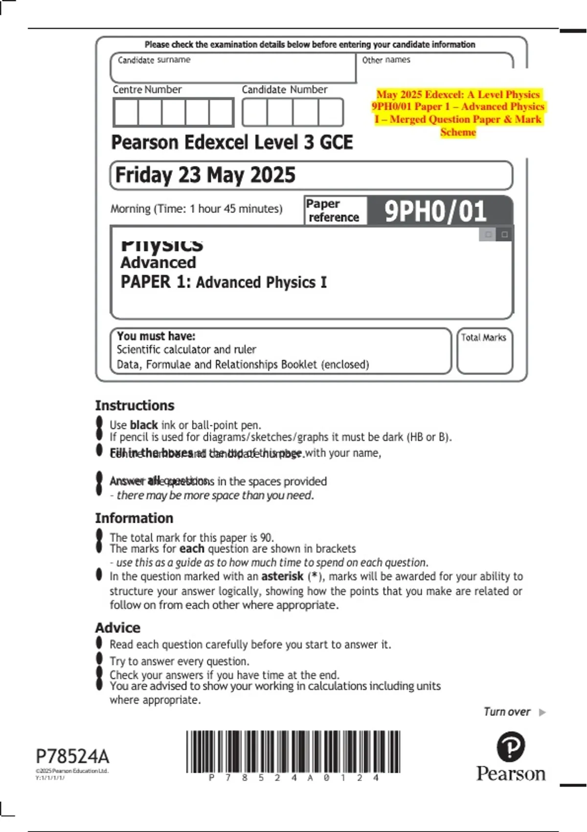 May 2025 Edexcel: A Level Physics 9PH0/01 Paper 1 – Advanced Physics I – Merged Question Paper & Mark Scheme