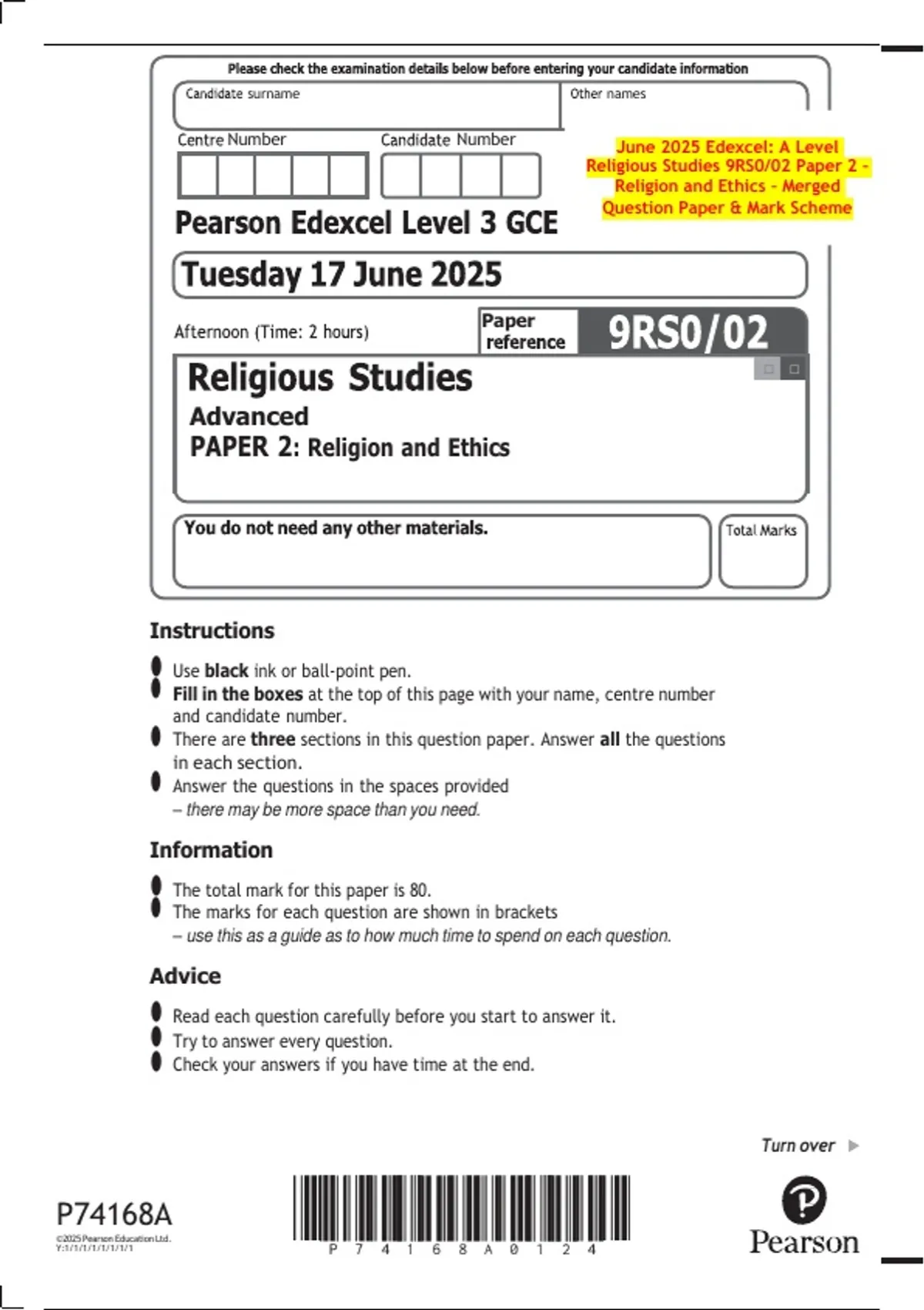 June 2025 Edexcel: A Level Religious Studies 9RS0/