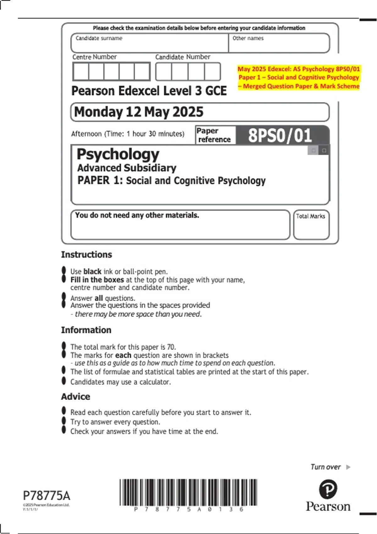 May 2025 Edexcel: AS Psychology 8PS0/01