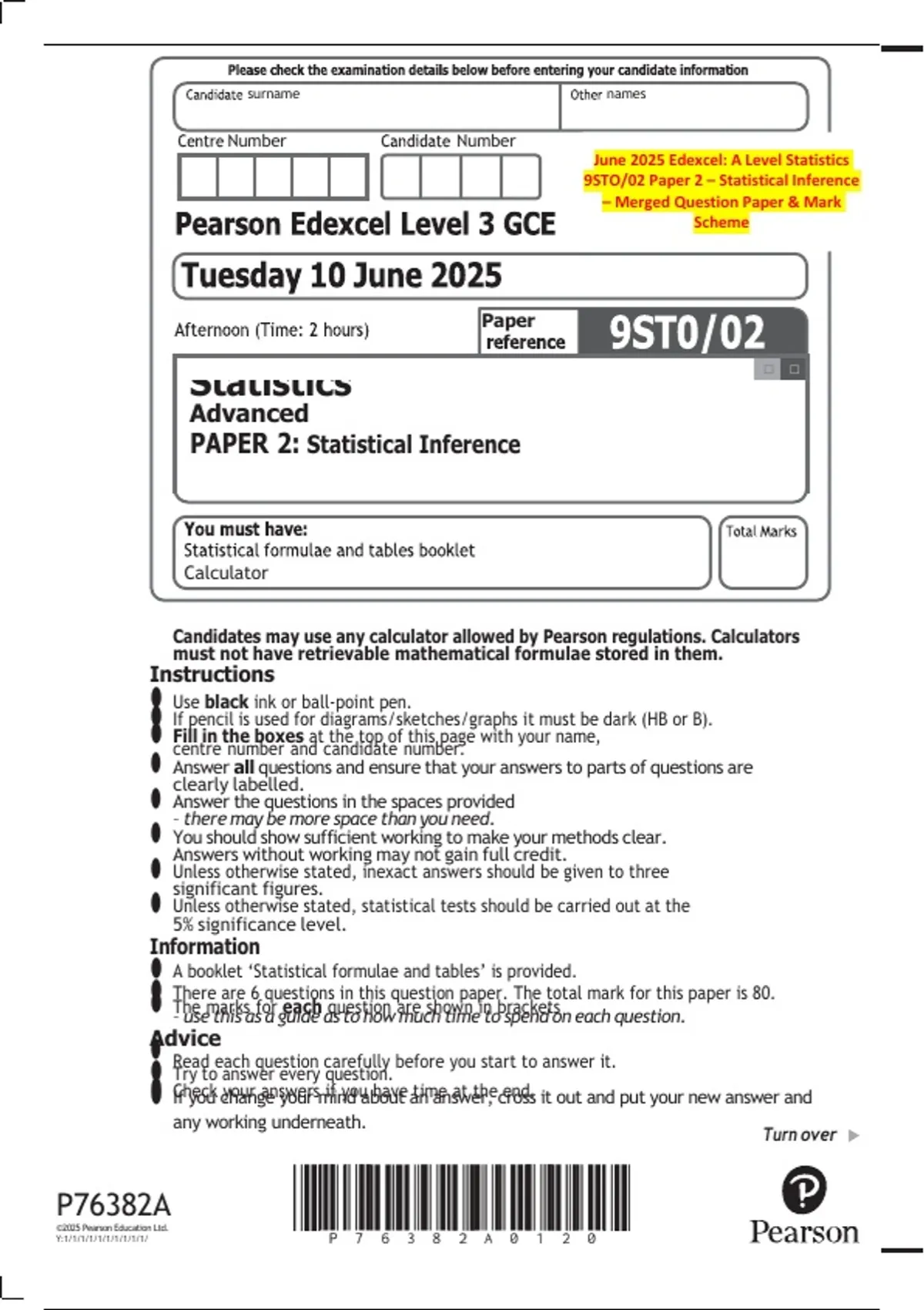 June 2025 Edexcel: A Level Statistics