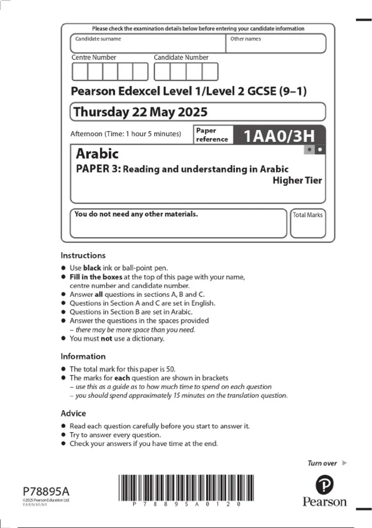 2025 Pearson Edexcel Level 1/Level 2 GCSE. Arabic PAPER 3: 1AA0/3H Reading and understanding in Arabic 2025 Pearson Edexcel Level 1/Level 2 GCSE Arabic PAPER 3: 1AA0/3H Reading and understanding in Arabic
