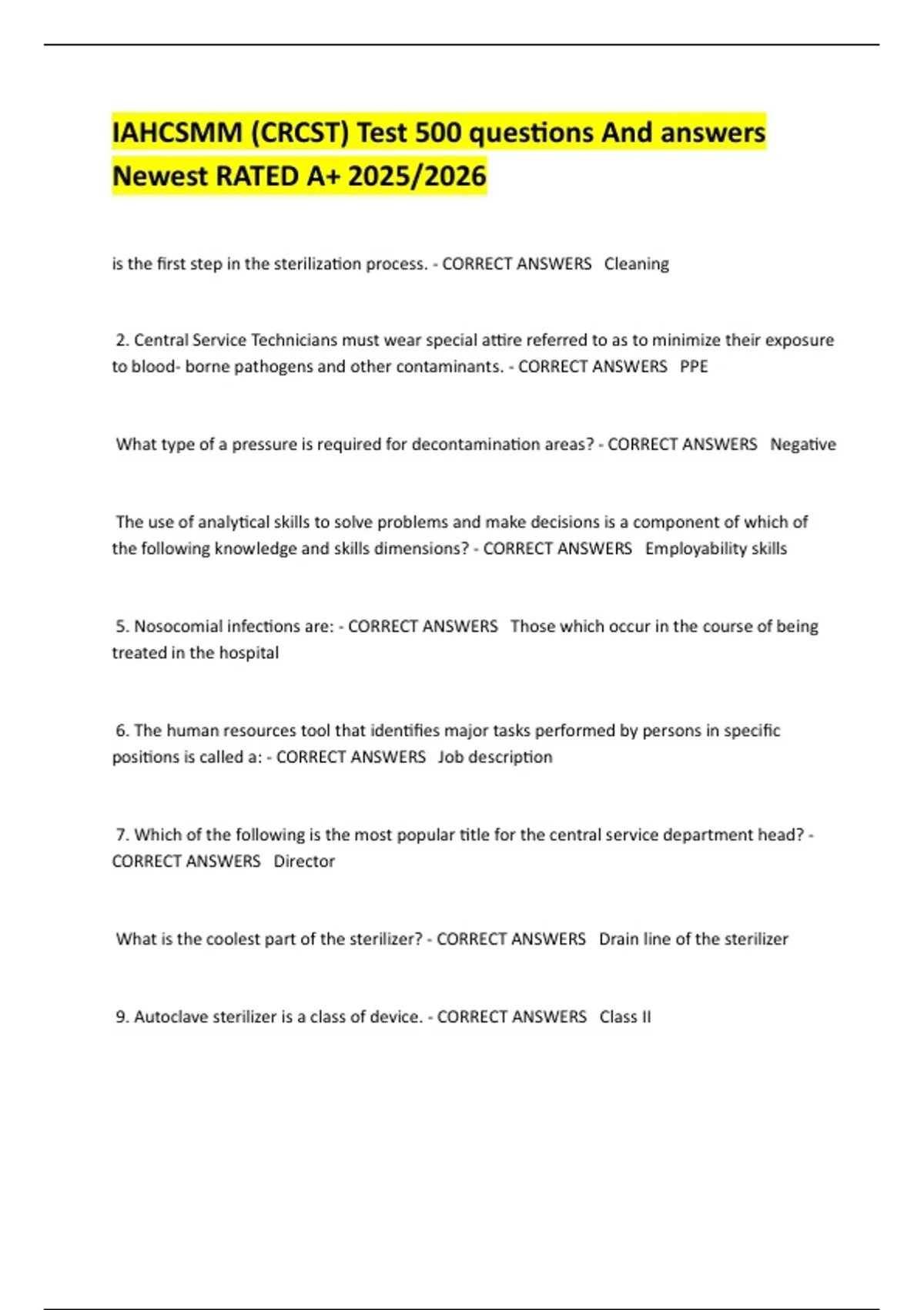 IAHCSMM (CRCST) Test 500 questions And answers Newest RATED A+ 2025/2026