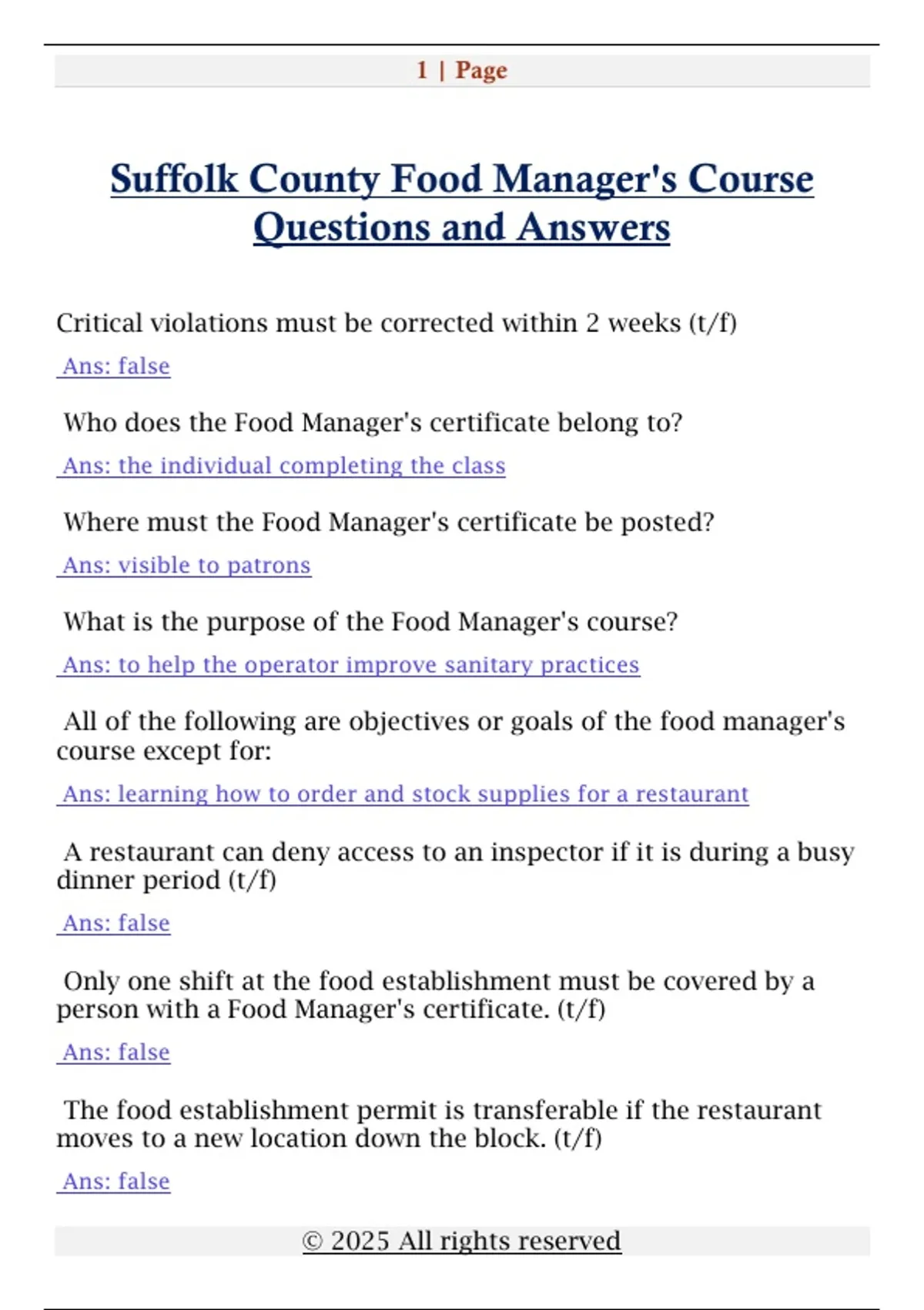Suffolk County Food Manager's Course Questions and Answers