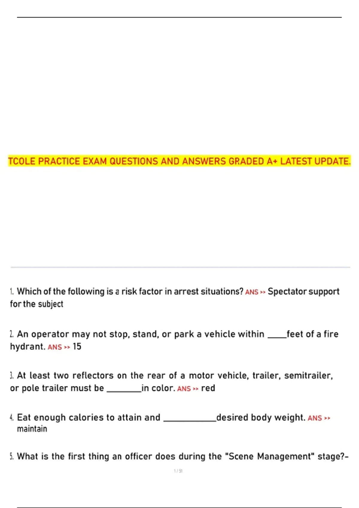 This document includes the most recent update of TCOLE (Texas Commission on Law Enforcement) practice exam questions with fully graded A+ answers. It covers essential areas such as Texas penal code, criminal procedures, policing ethics, investigations, and public safety practices. The material is structured to reflect actual exam content, providing accurate explanations and effective preparation support.
