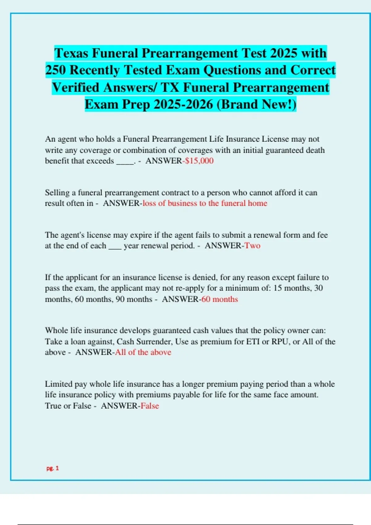 Texas Funeral Prearrangement Test 2025 with 250 Recently Tested Exam Questions and Correct Verified Answers/ TX Funeral Prearrangement Exam Prep (Brand New!)